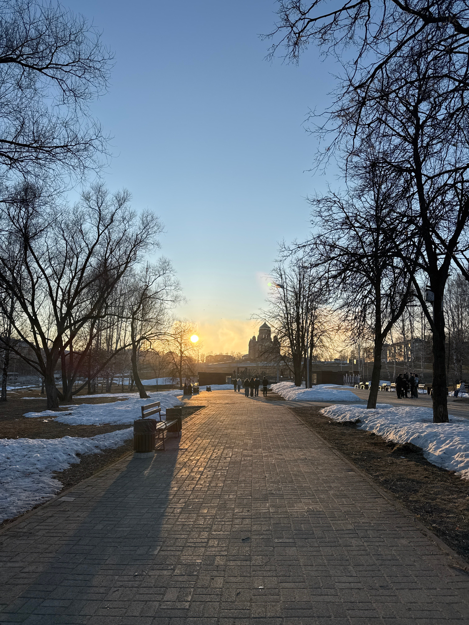 The image depicts a brick walkway in a park-like setting in Berezniki, Russia, during the late afternoon or early evening. The sun, low on the horizon, is visible between bare trees, casting long shad…read more