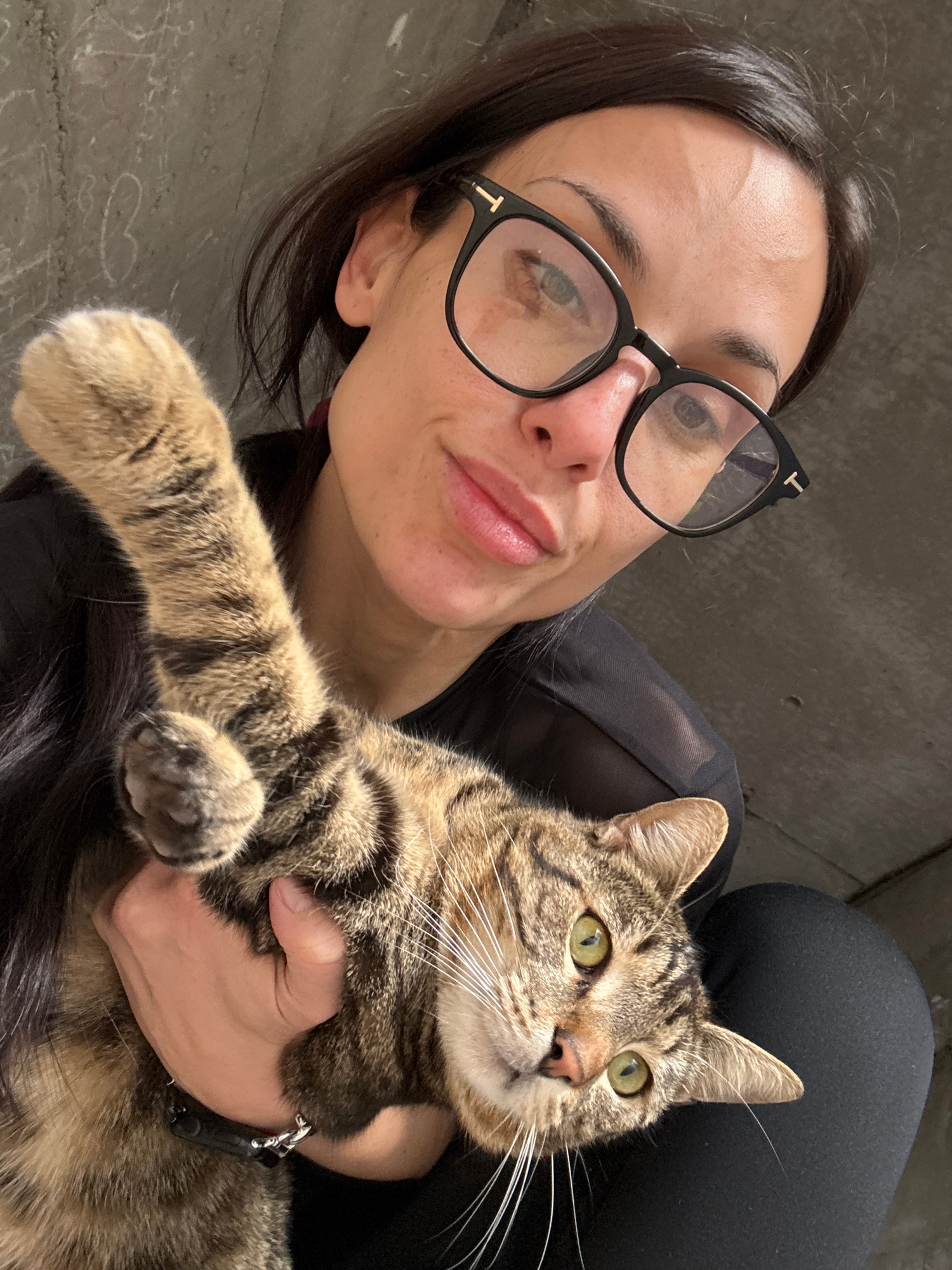 A close-up, high-angle selfie-style image captures an adult female in Pleven, Bulgaria, holding a tabby cat. The female has dark hair, wears black-rimmed glasses with a visible 'T' logo on the temples…read more