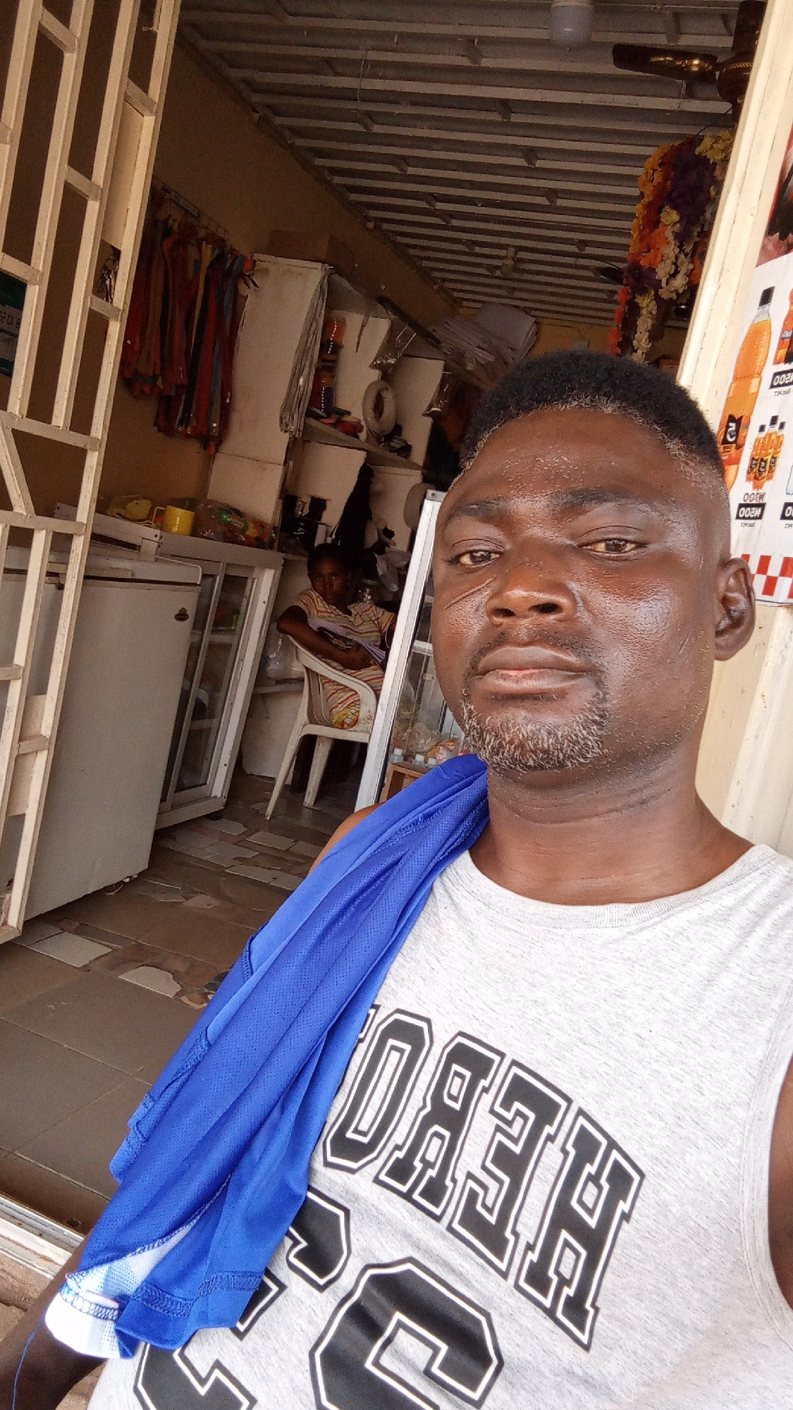 A selfie captures a man standing inside what appears to be a small shop or kiosk in Sabon Tasha, Nigeria. The man, with dark skin, a closely cropped dark haircut, and a short, greyish beard and mustac…read more