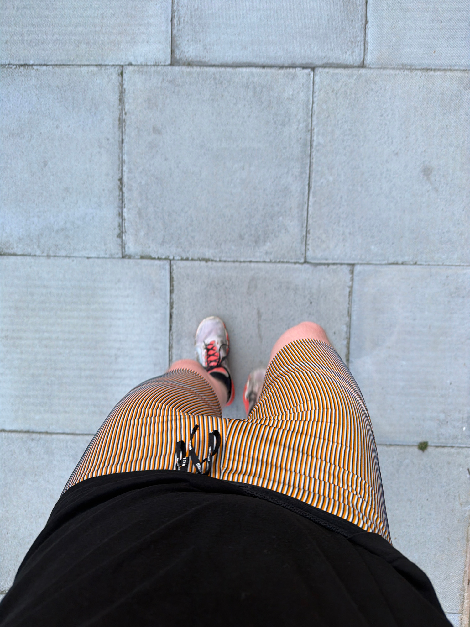 An overhead photograph captures a person's lower body, from approximately the waist down, standing on a paved outdoor surface in London, United Kingdom. The individual is wearing horizontally striped…read more