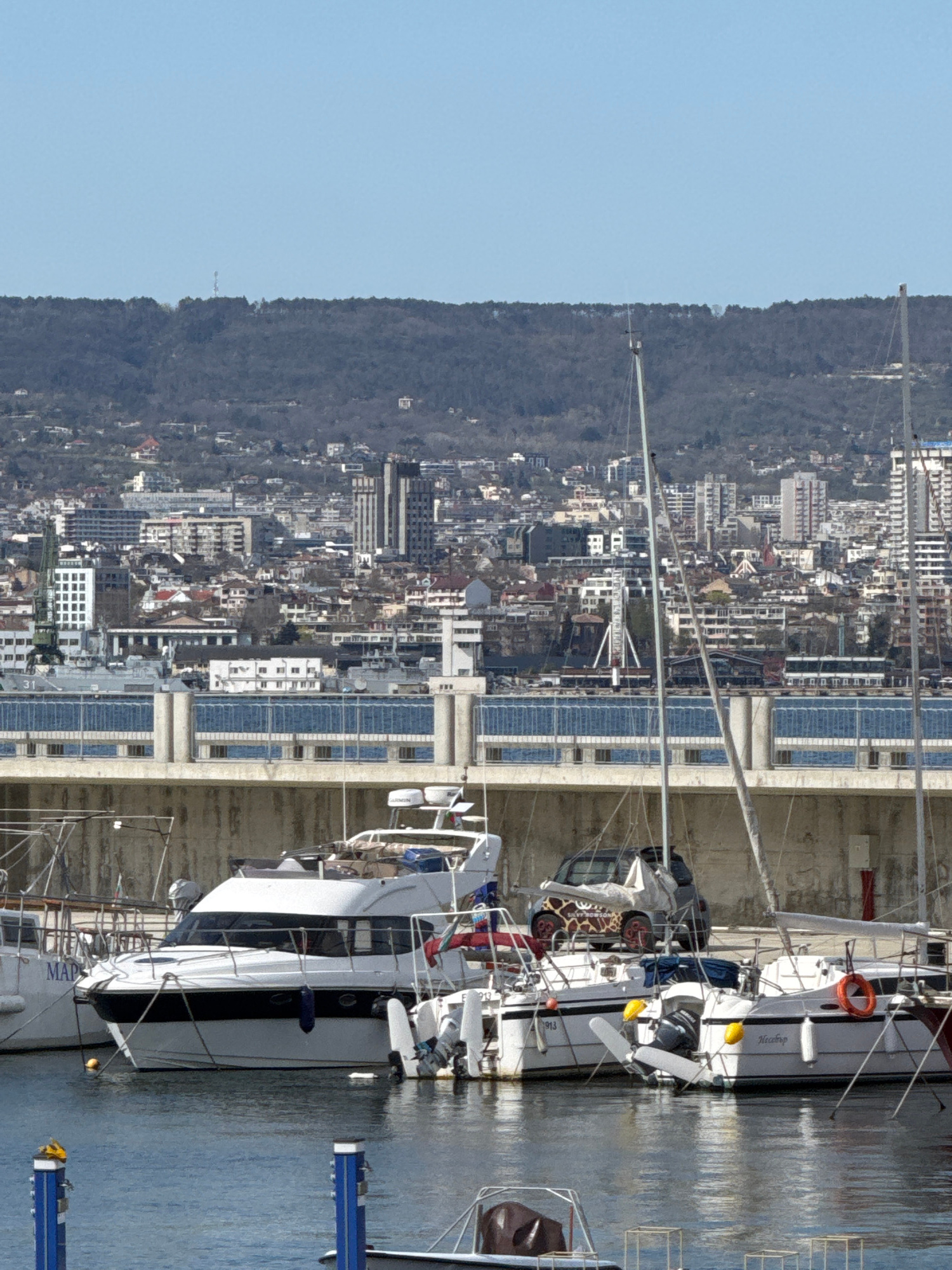 This image depicts a serene coastal scene in Varna, Bulgaria, under a clear, bright blue sky. In the foreground on the right, a marina hosts several docked boats. The most prominent vessel is a white…read more