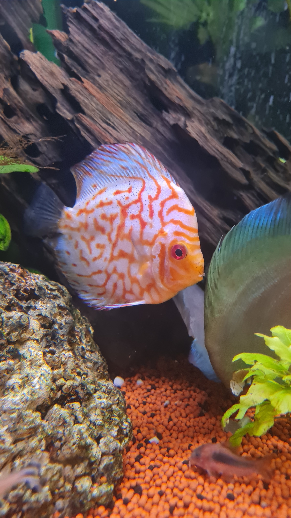 An underwater close-up shot captures a vibrant aquarium scene. The central subject is a beautifully patterned Discus fish, facing slightly towards the left. It features a bright orange head with a str…read more