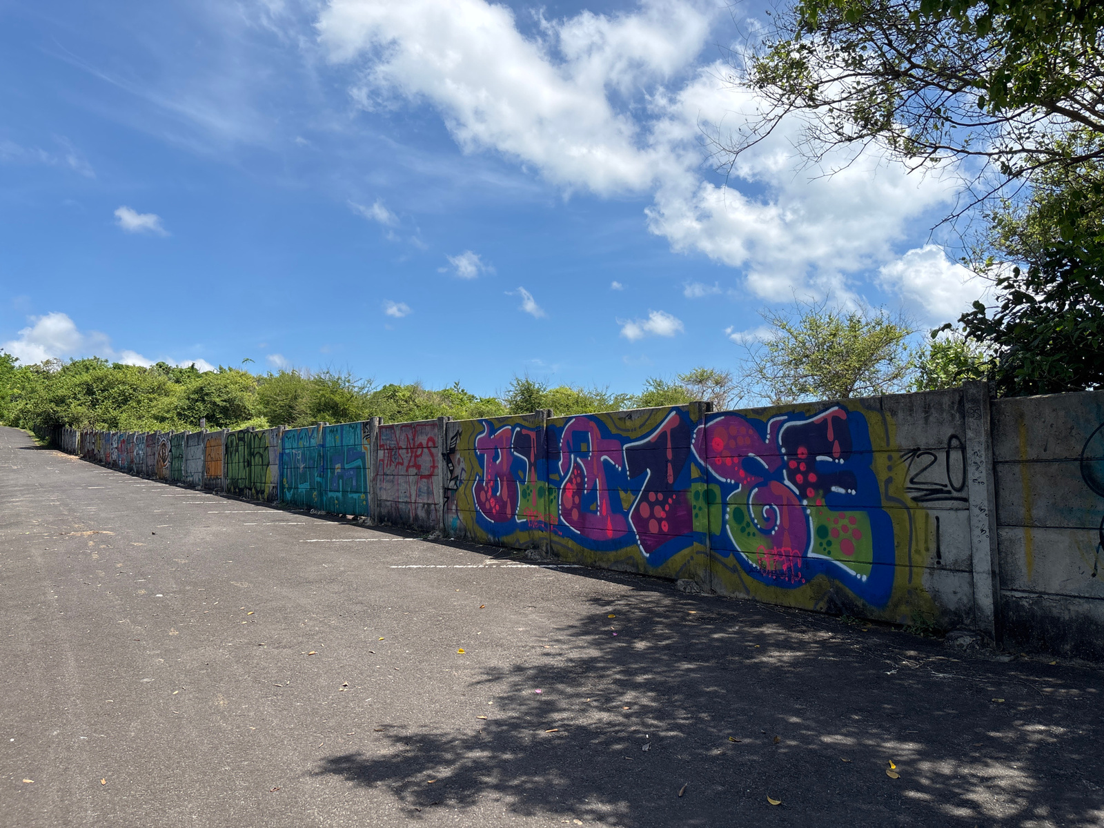 The image depicts an outdoor scene in an unknown location in Indonesia. An asphalt road stretches into the distance along a long, gray concrete wall. The wall is covered in graffiti, varying in color…read more