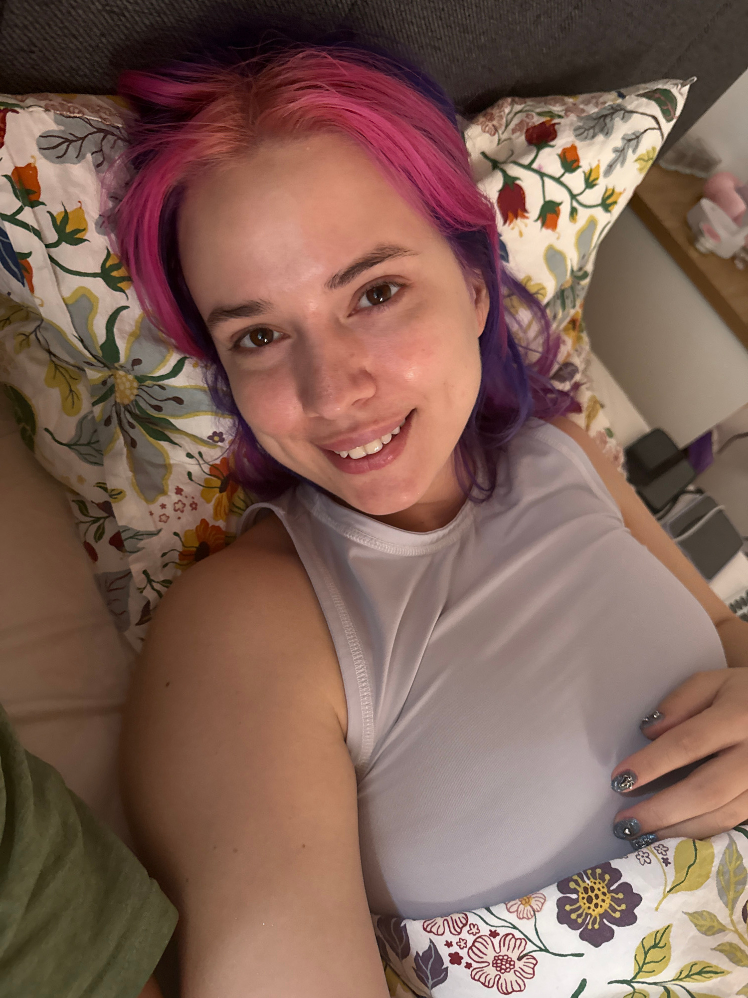 A woman with pink and purple hair is lying on a bed with floral patterned pillows and sheets. She is wearing a light gray sleeveless top and is smiling at the camera. Her left hand is resting near herβ¦read more