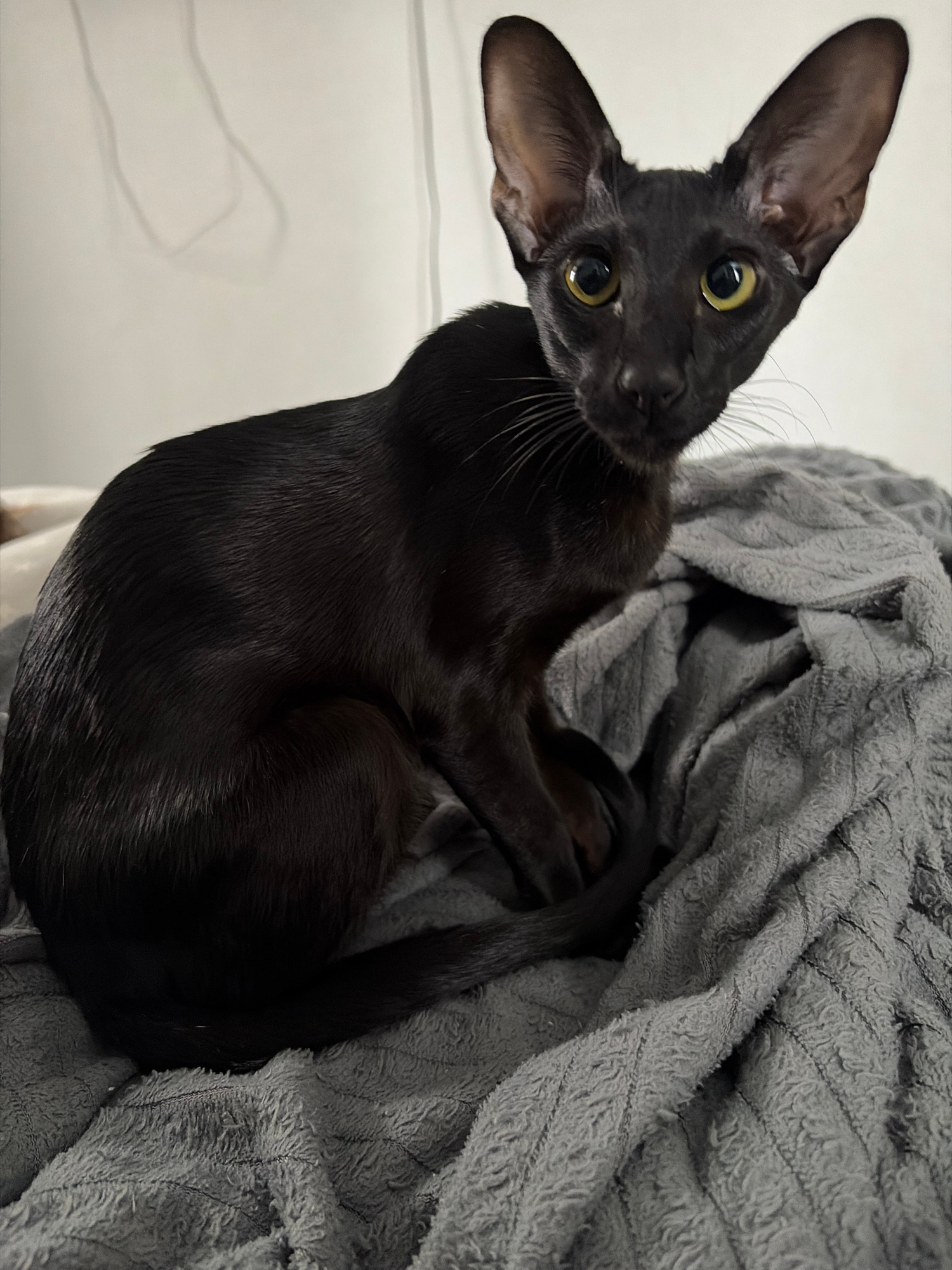 A black cat with large ears and green-yellow eyes is lying on a gray, textured blanket. The cat is looking at the camera with its head tilted. The background appears to be a white wall. There is no in…read more