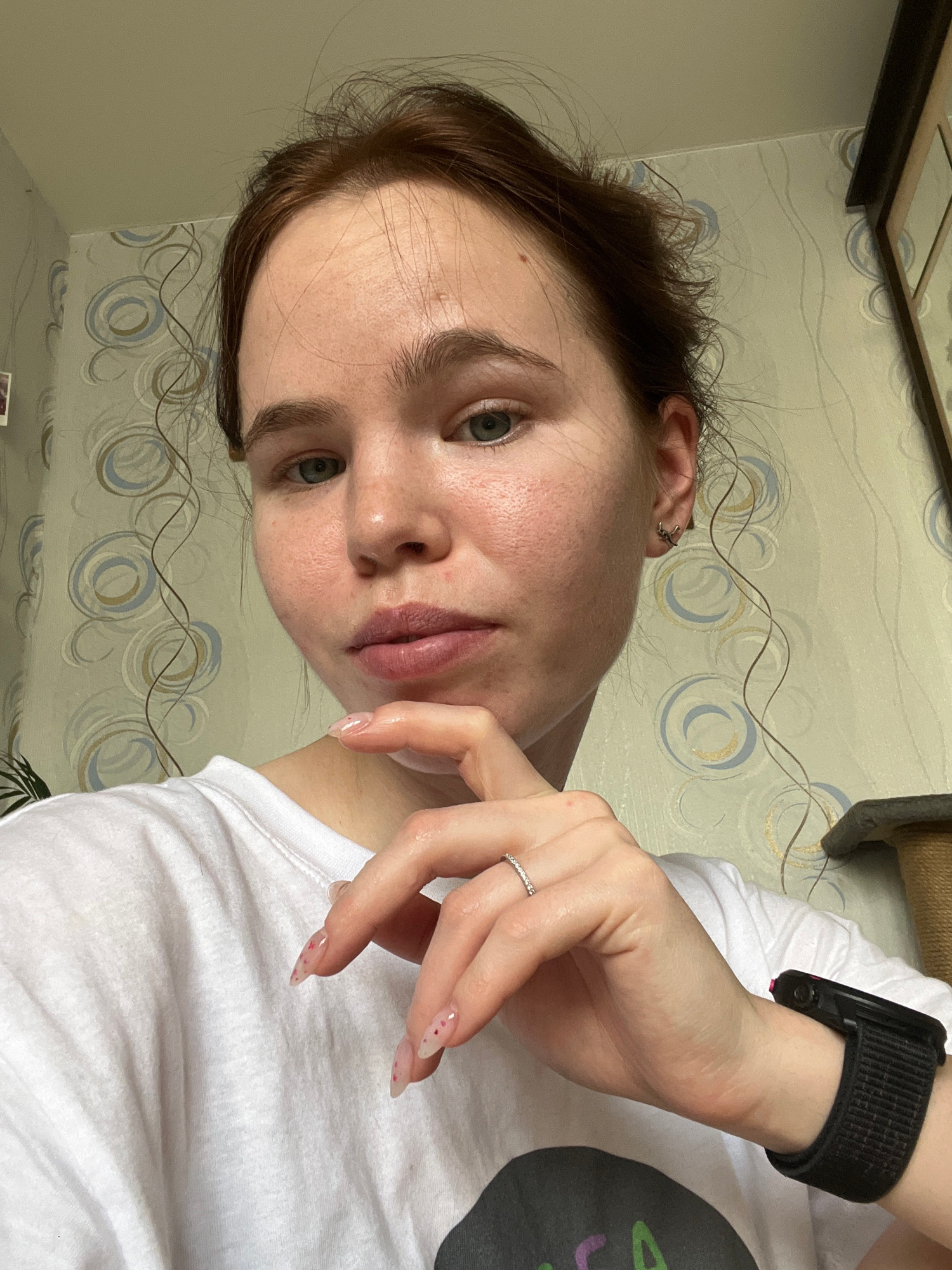 A young woman is captured in a vertical selfie, holding her left hand near her chin while looking directly at the camera with a neutral expression. She has light skin, dark brown hair, and light-color…read more