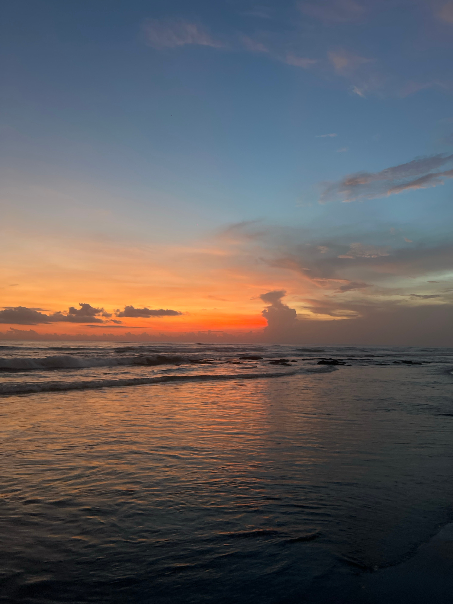 The image depicts a sunset over the ocean in Canggu, Indonesia. The sky transitions from a pale blue on the left to a vibrant orange and red in the center, with scattered clouds. The ocean on the righ…read more