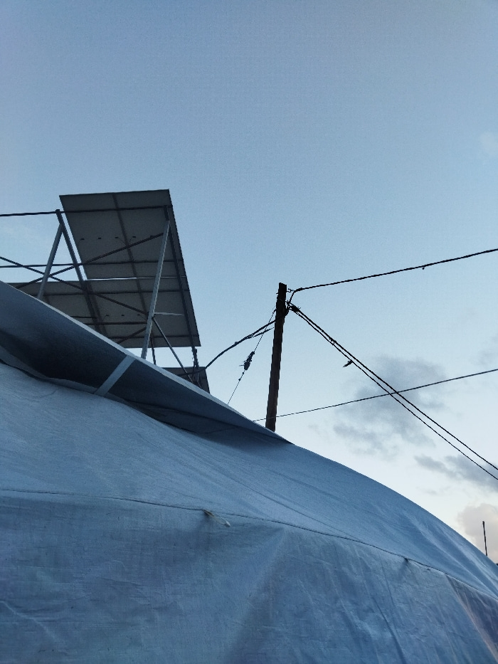 This image depicts an outdoor scene in Khan Yunis, Palestinian Territory, from a low-angle perspective looking upwards towards the sky. The lower left portion of the frame is occupied by a large, ligh…read more