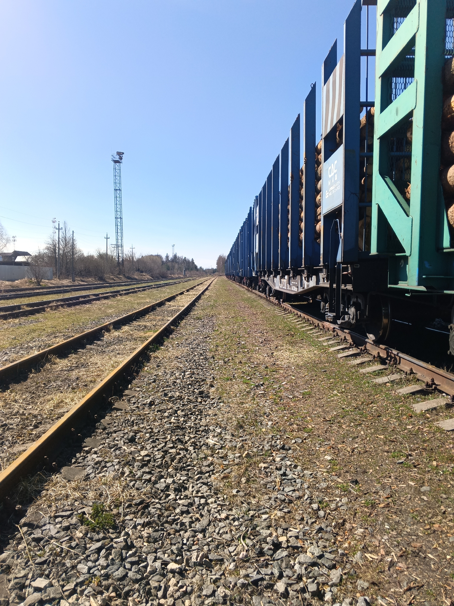The image captures a long freight train loaded with logs, parked on a railway track in Andreyevo, Russia. The train, consisting of numerous blue and green open-top freight cars, occupies the right sid…read more