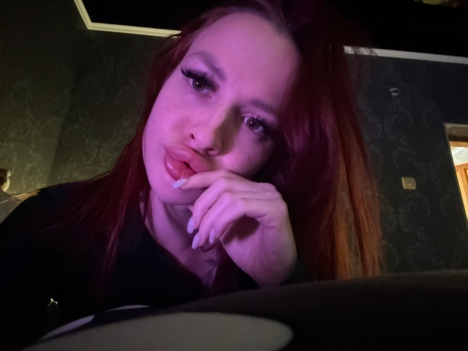 A woman with long, auburn hair is positioned upside down, with her face angled towards the camera. She has fair skin, light-colored eyes, and wears false eyelashes. Her lips are slightly parted, and o…read more