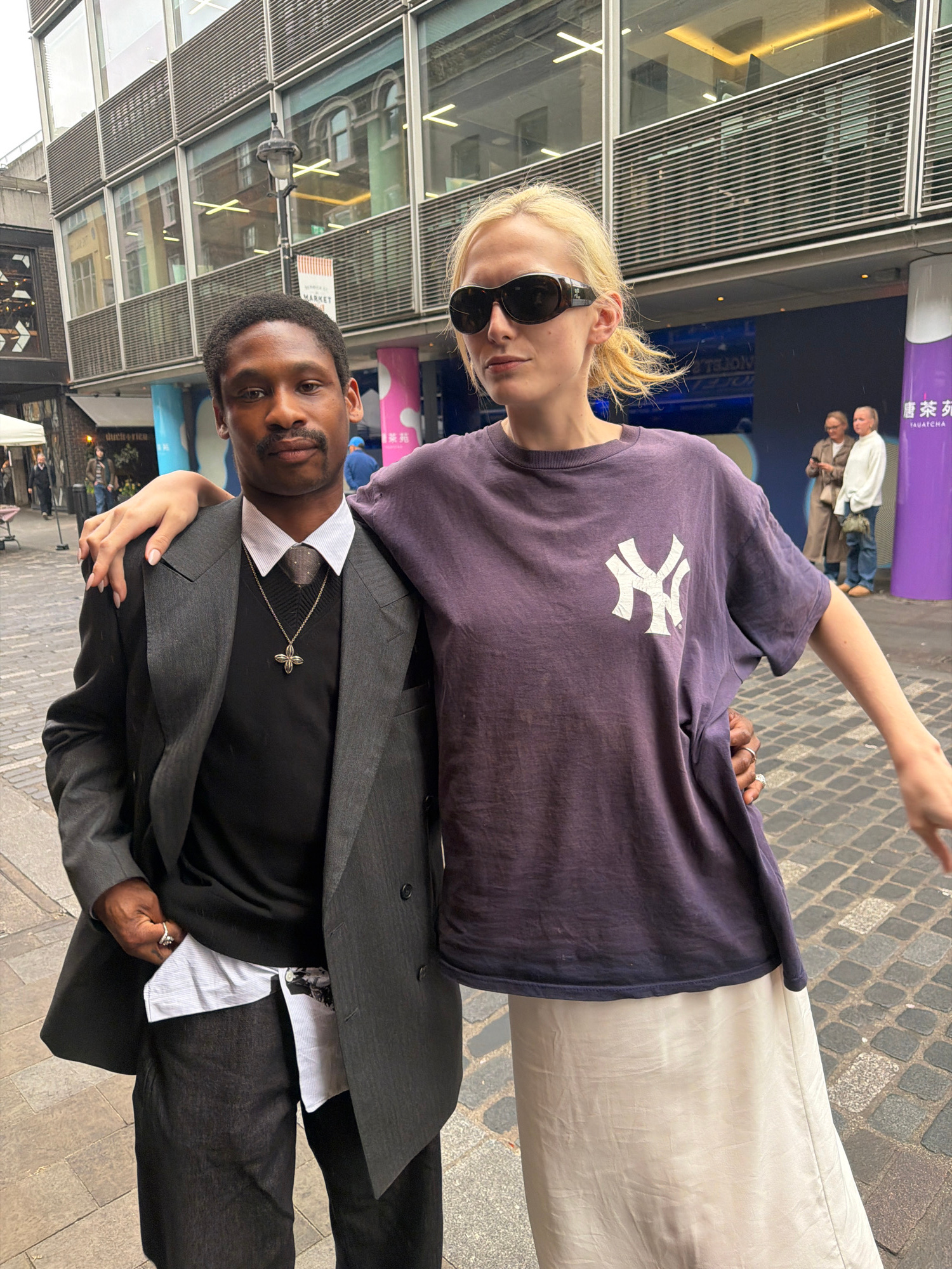 Two individuals are pictured in an outdoor urban setting. The background includes a building with architectural details and signage in English and other languages. Cobblestone pavement is visible. A…read more