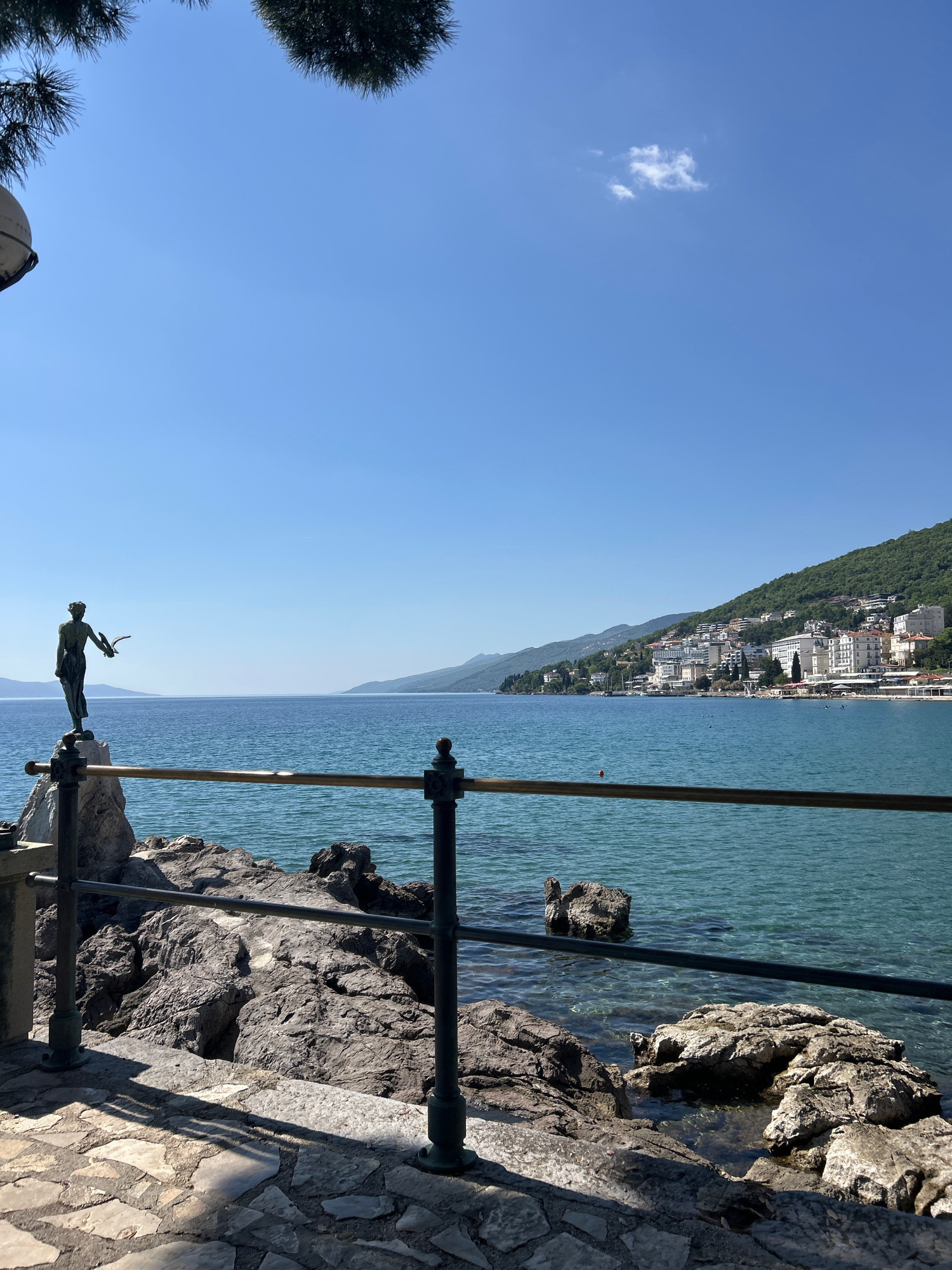This media file presents a scenic coastal landscape, likely captured on a bright, clear day in Grad Opatija, Croatia. The image is oriented to show a vast expanse of clear blue sky at the top, with a…read more