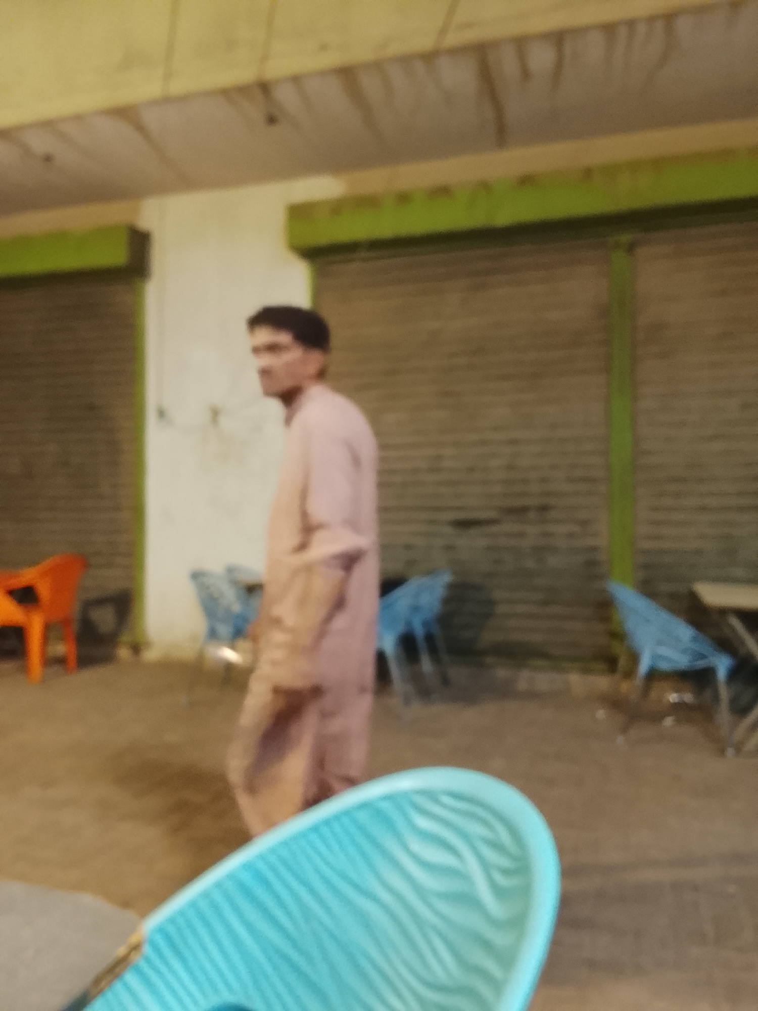 A man is walking past a closed storefront in Multan, Pakistan. He is wearing a long, light-colored garment. The storefront has a green trim. Blue and orange plastic chairs are scattered around.