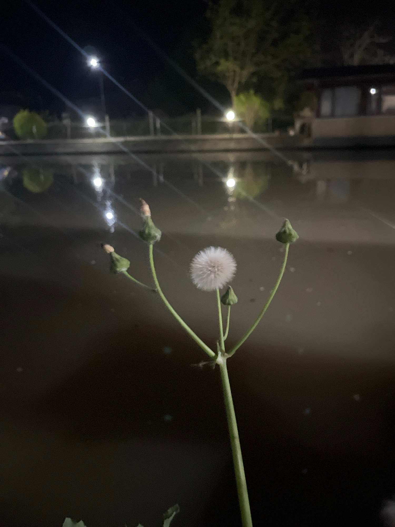 The media file displays a close-up of a plant stem against a dark, nocturnal background, likely viewed through a reflective surface such as a window. The central subject is a green stem branching into…read more