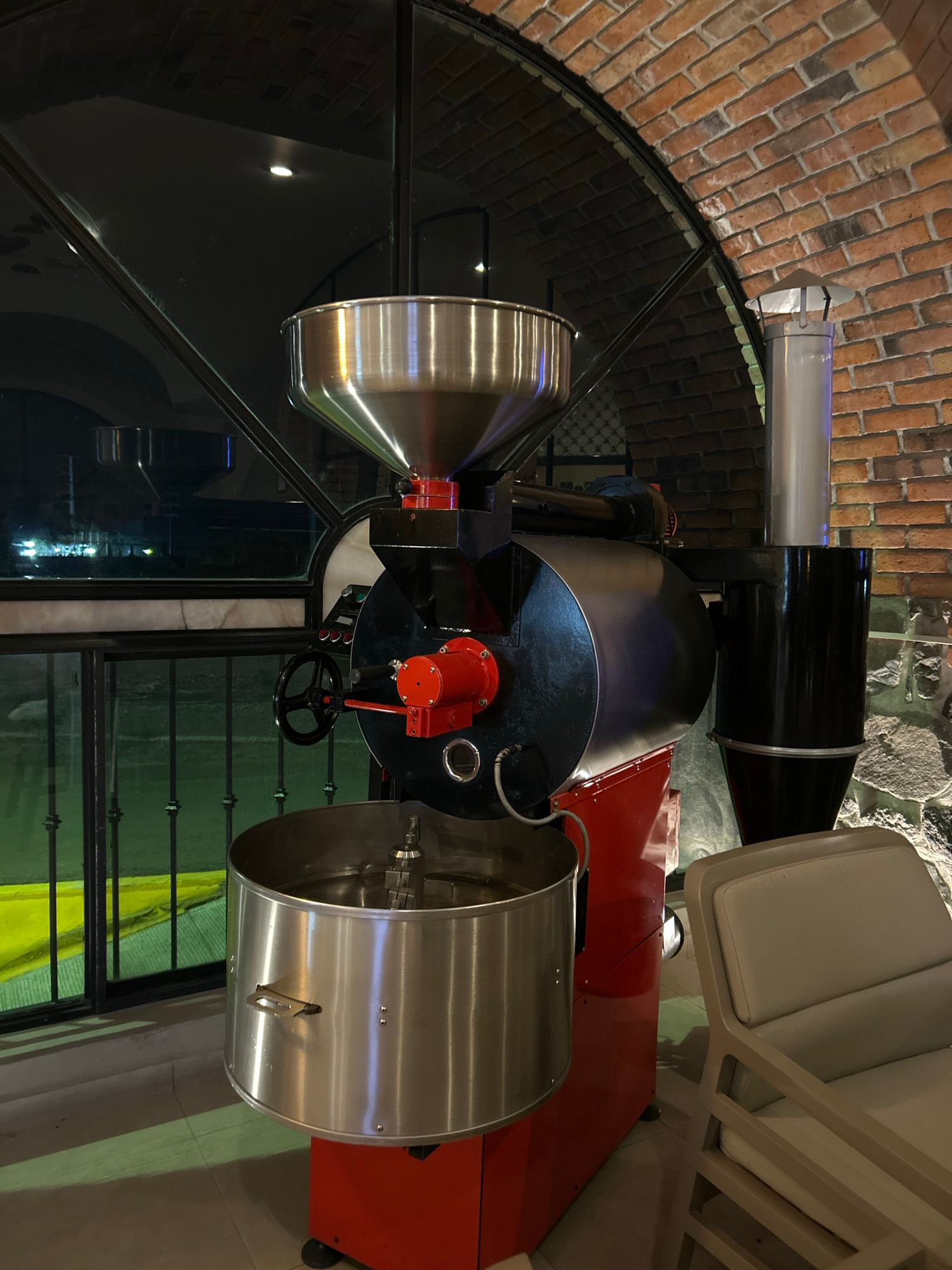 The image shows a coffee roasting machine inside a building in Santa Ana Yancuitlalpan (Chilhuacán), Mexico. The machine is primarily black and silver, with red components. It has a cylindrical roasti…read more