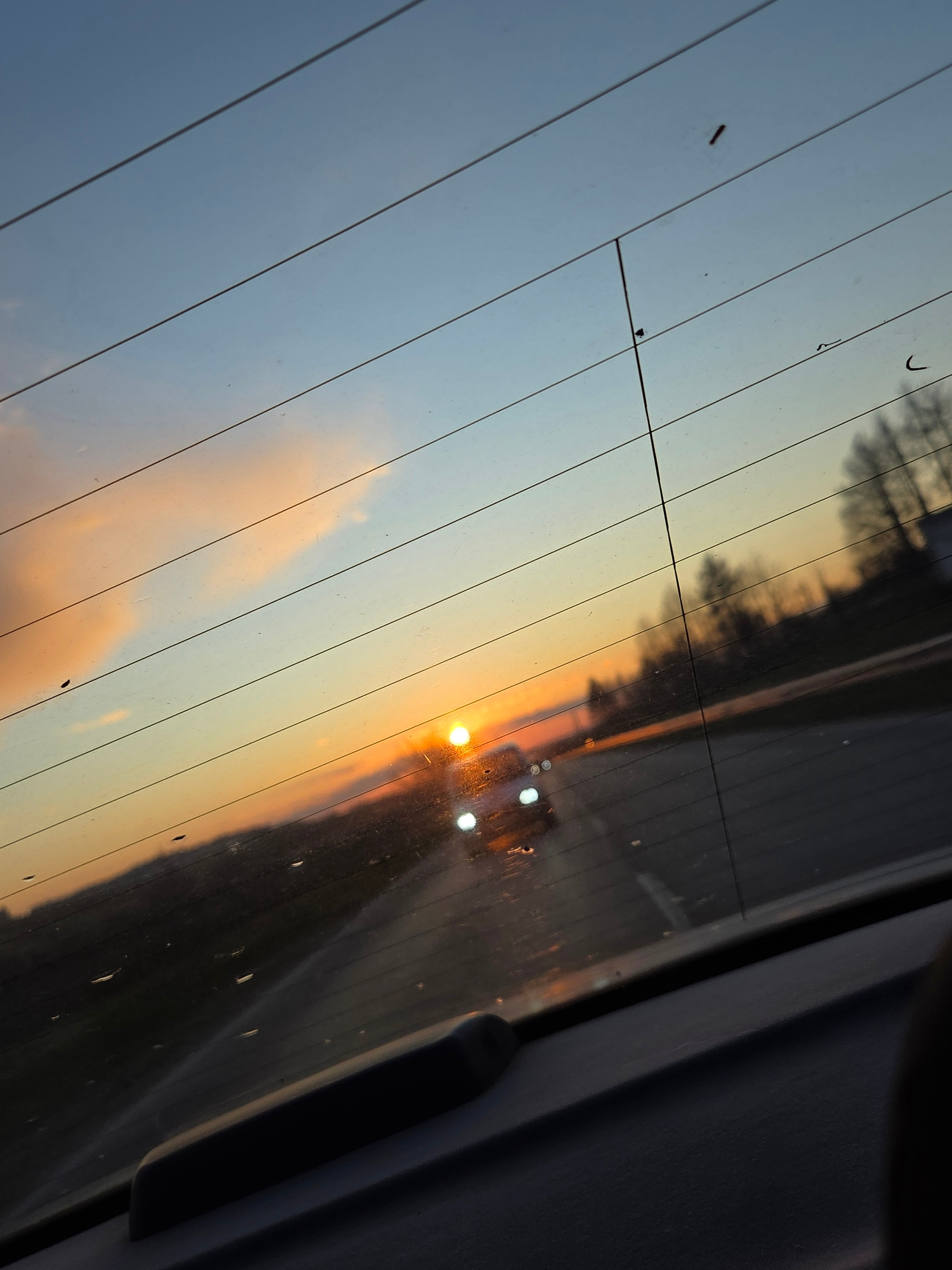 The image shows a view through a car's rear window at dusk or dawn. The sky displays a gradient of colors, from blue to orange, with visible clouds. The sun is positioned low on the horizon, creating…read more