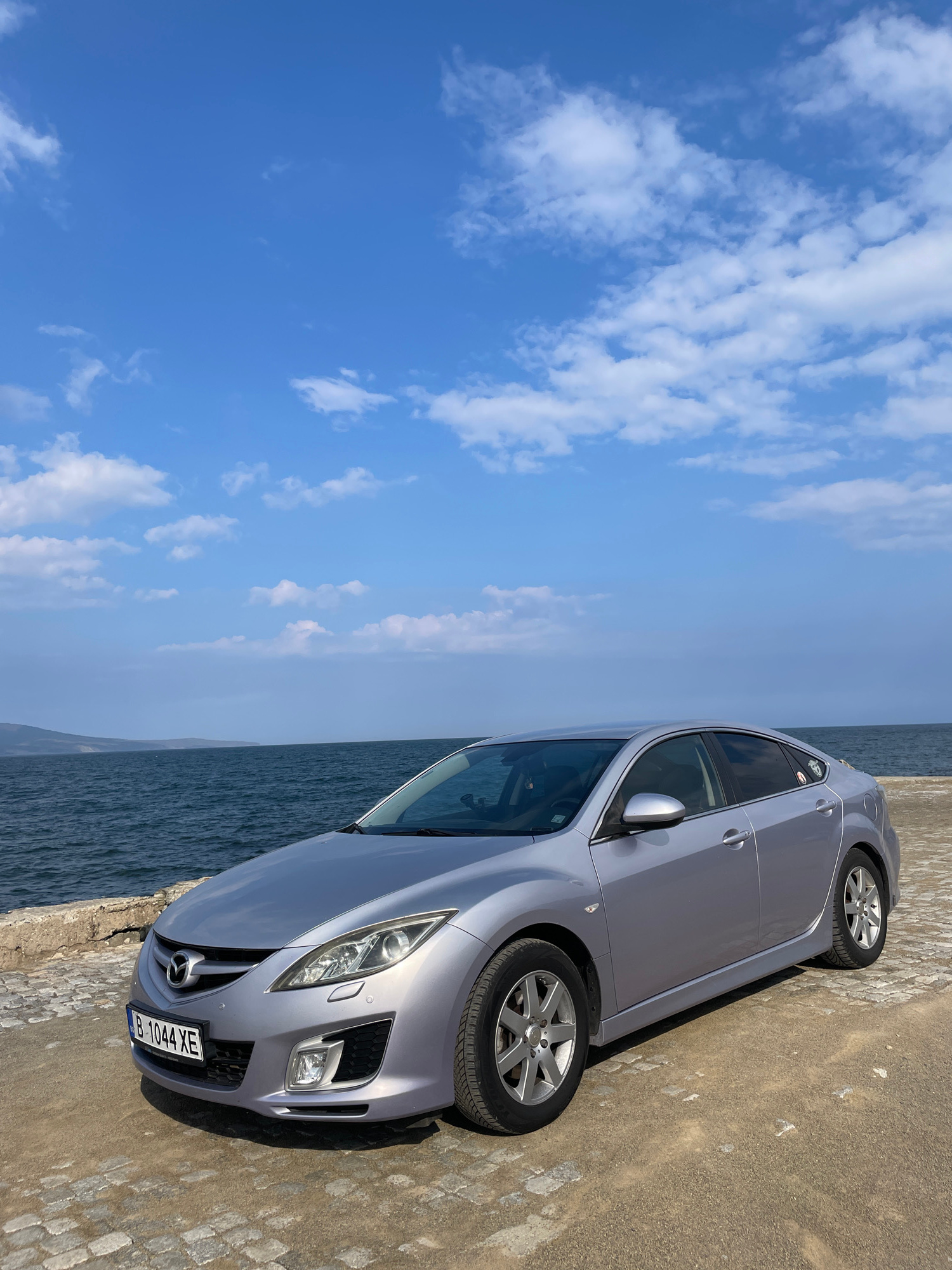 A silver Mazda 6 sedan is parked on a concrete embankment, positioned between the sea and a clear, blue sky dotted with scattered clouds. The car is angled to the right, with its front end closest to…read more