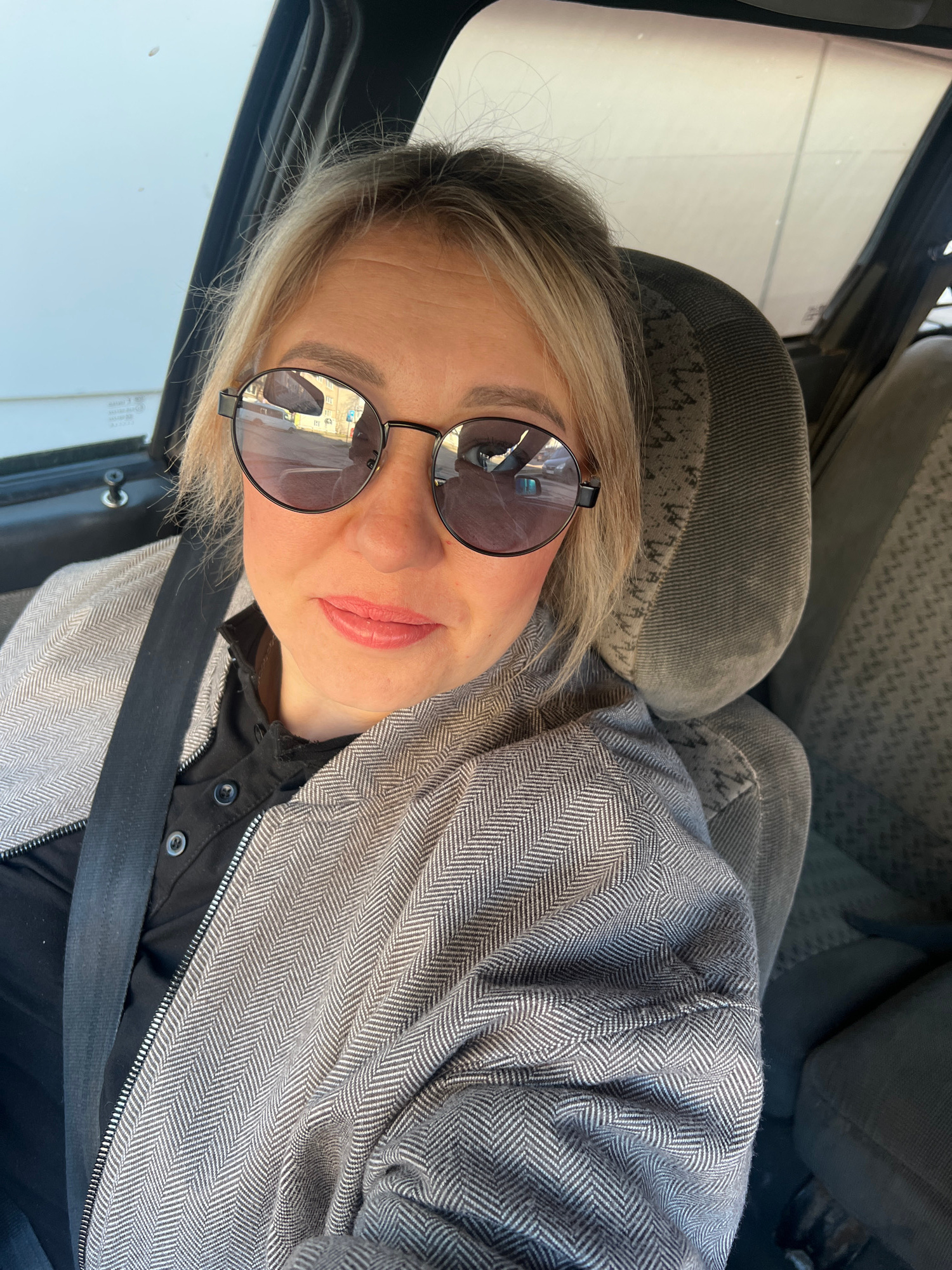 A sideways selfie captures a blonde-haired woman seated in the passenger seat of a car, set in Chaikovsky, Russia. She wears round, dark sunglasses that reflect a street scene with buildings and vehic…read more
