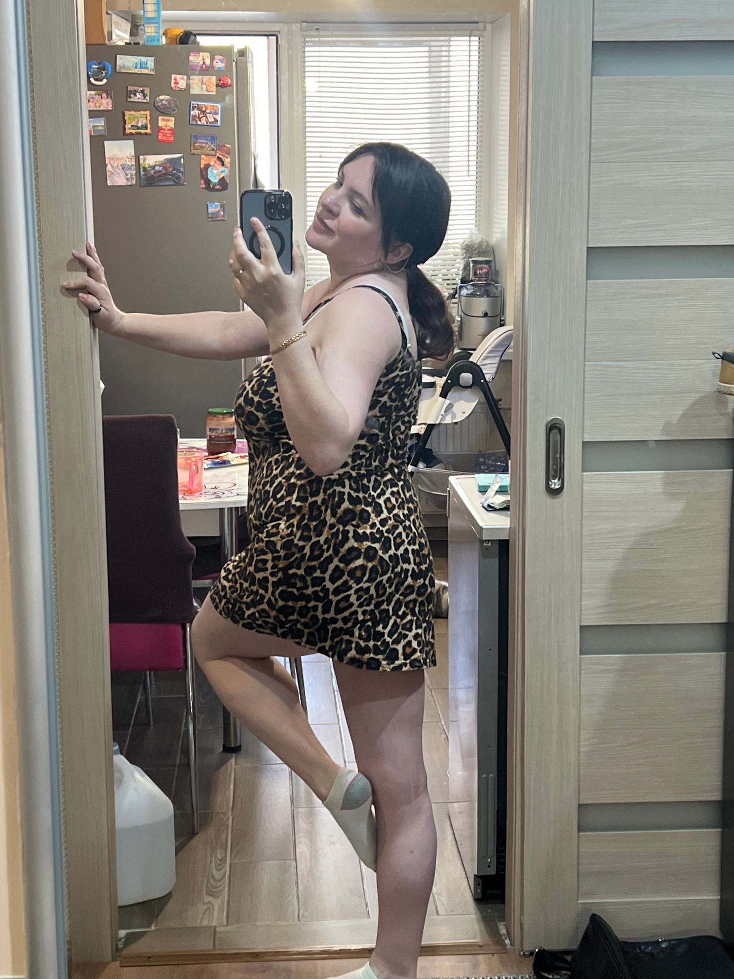 A woman is captured in a full-body mirror reflection, posing dynamically while taking a selfie or video with her smartphone. She wears a leopard print mini-dress and light-colored socks, with her dark…read more