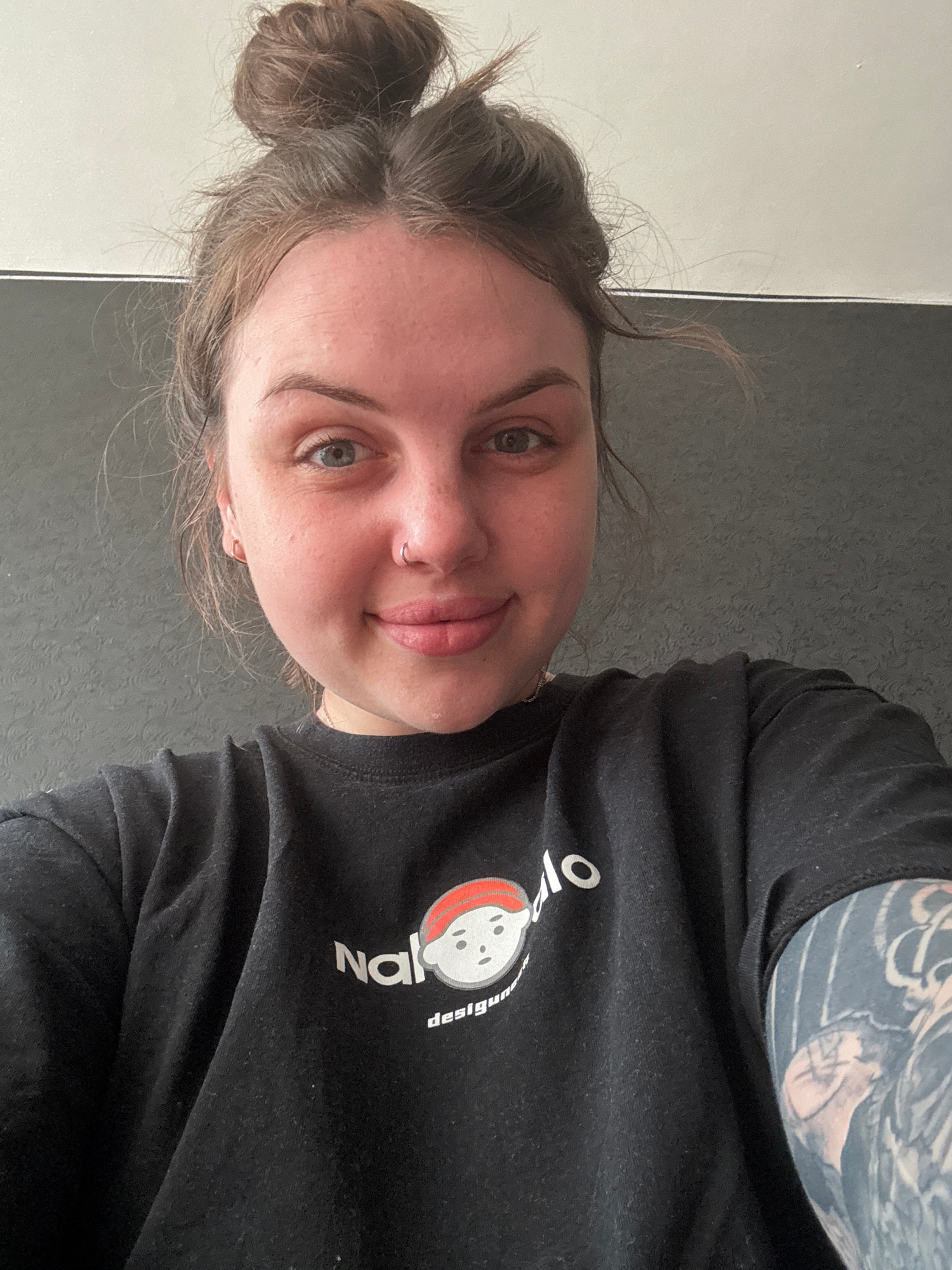 A person is looking at the camera. They have their hair in a bun, and have a nose piercing. The person is wearing a black shirt with a graphic on it. There is an arm with a tattoo visible. The backgro…read more
