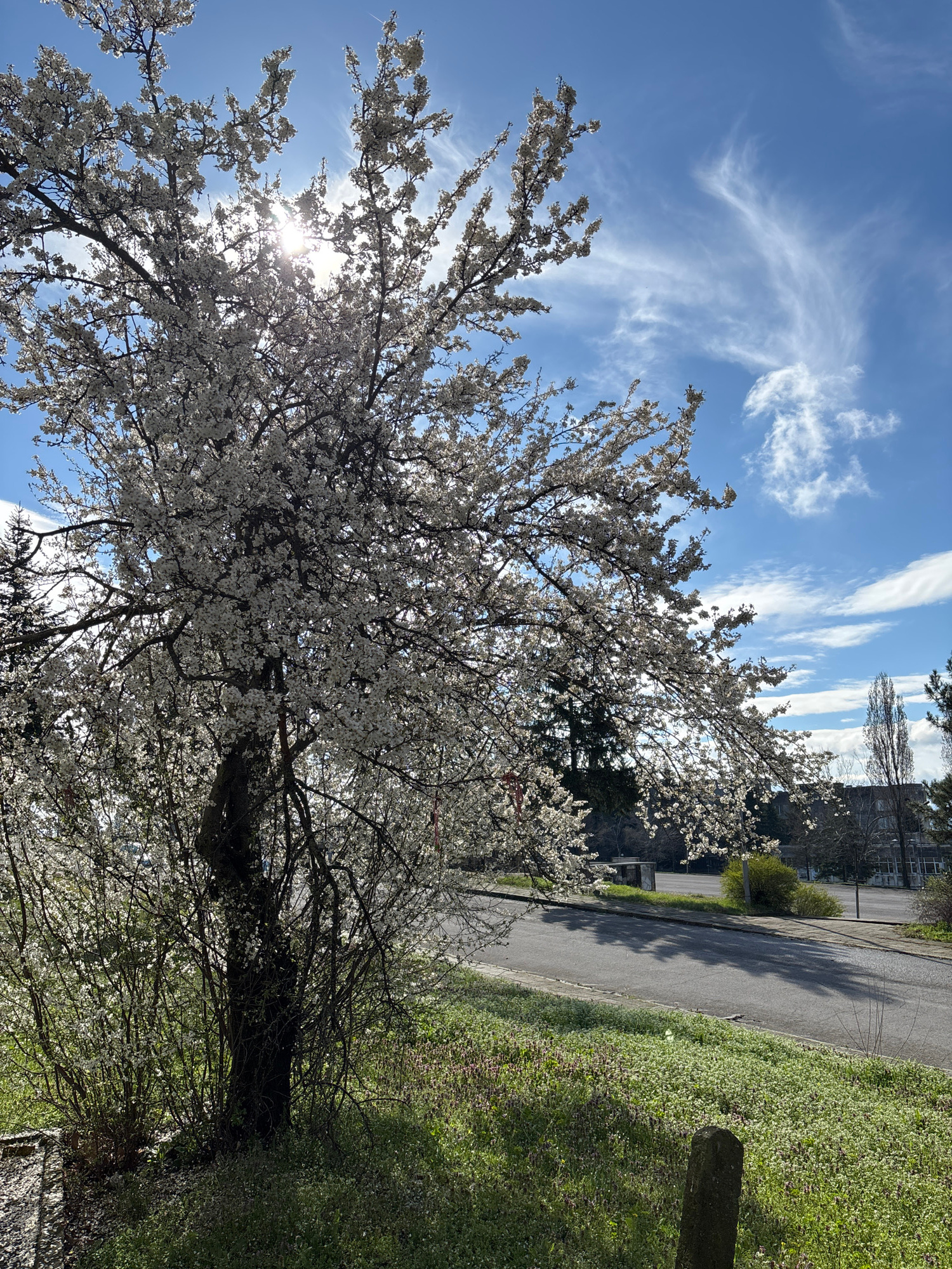The image shows a tree in full bloom with white flowers against a bright blue sky with wispy white clouds. The sun is visible behind the tree branches, creating a lens flare effect. To the right, a pa…read more
