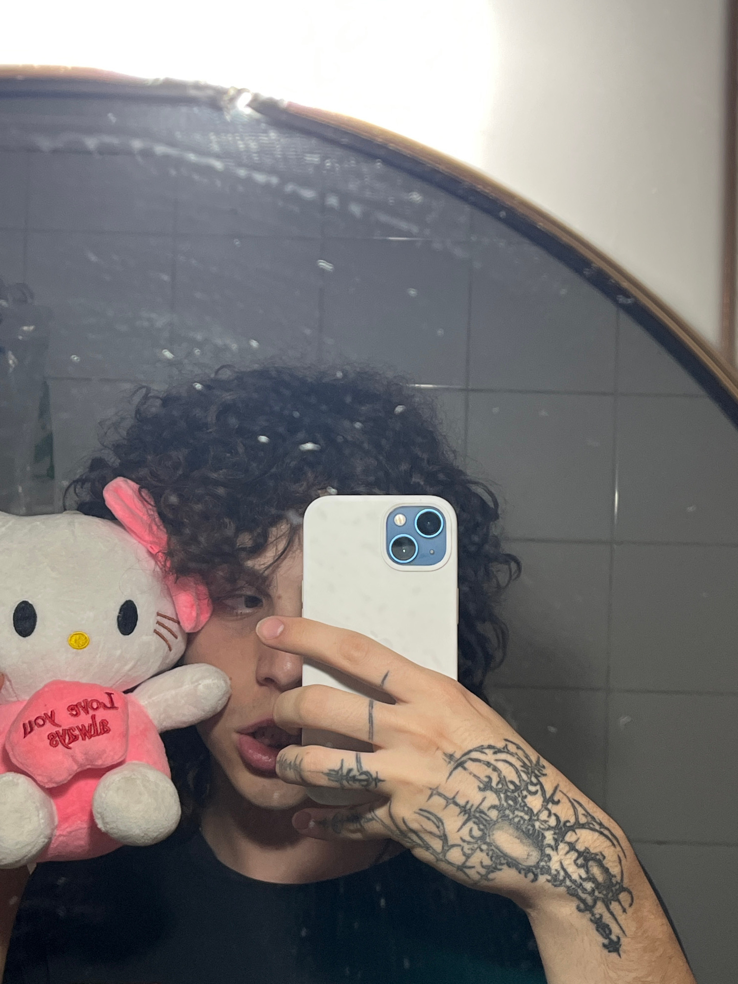 A person with curly hair is taking a selfie in a mirror. The person is holding a white iPhone with multiple cameras and is sticking out their tongue. Their hand has a large, intricate tattoo on the ba…read more