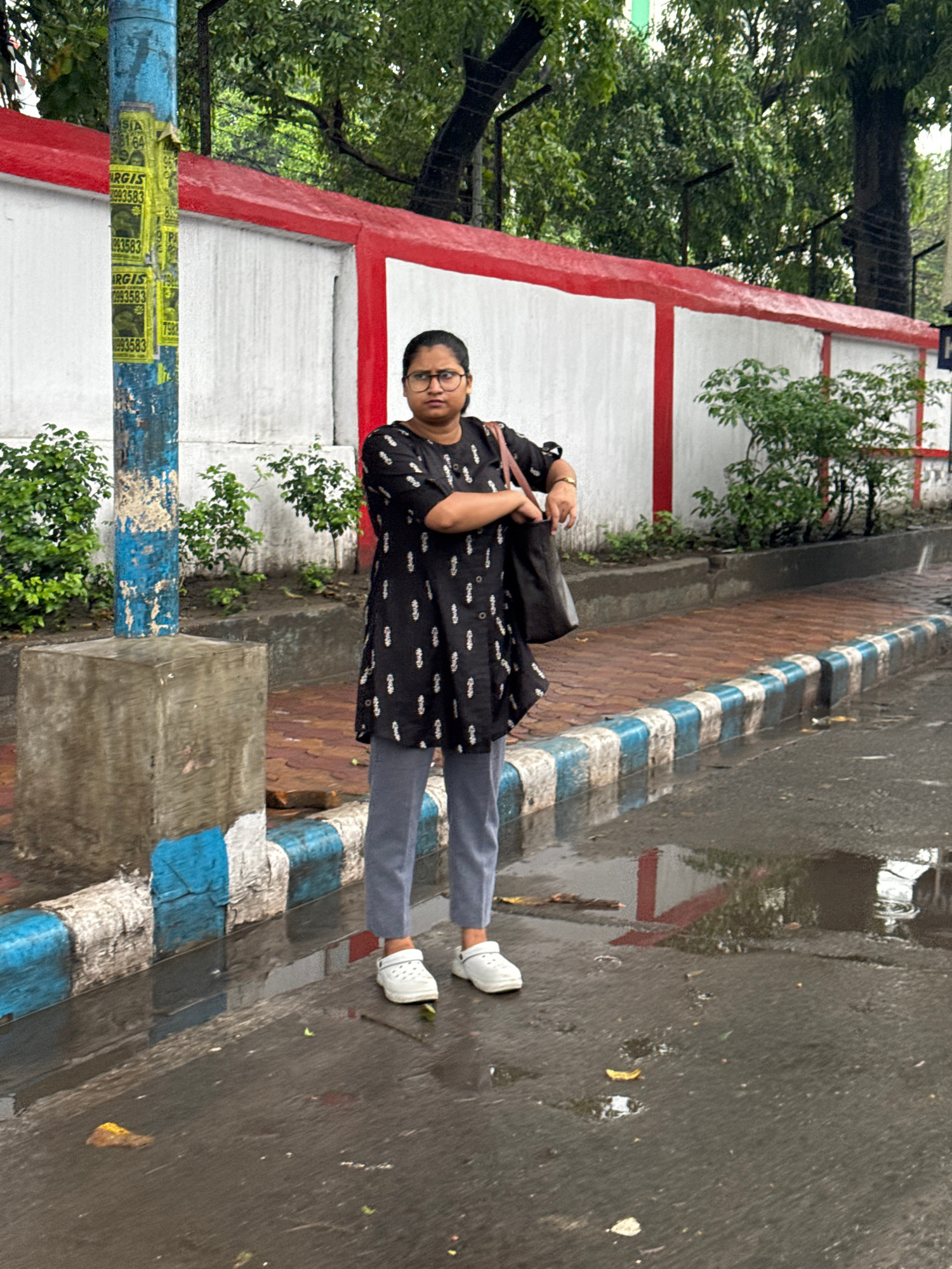 The image depicts a woman standing on a wet sidewalk in Kolkata, India. She is wearing glasses, a patterned black tunic, gray pants, and white shoes. She has a black bag slung over her shoulder. The s…read more