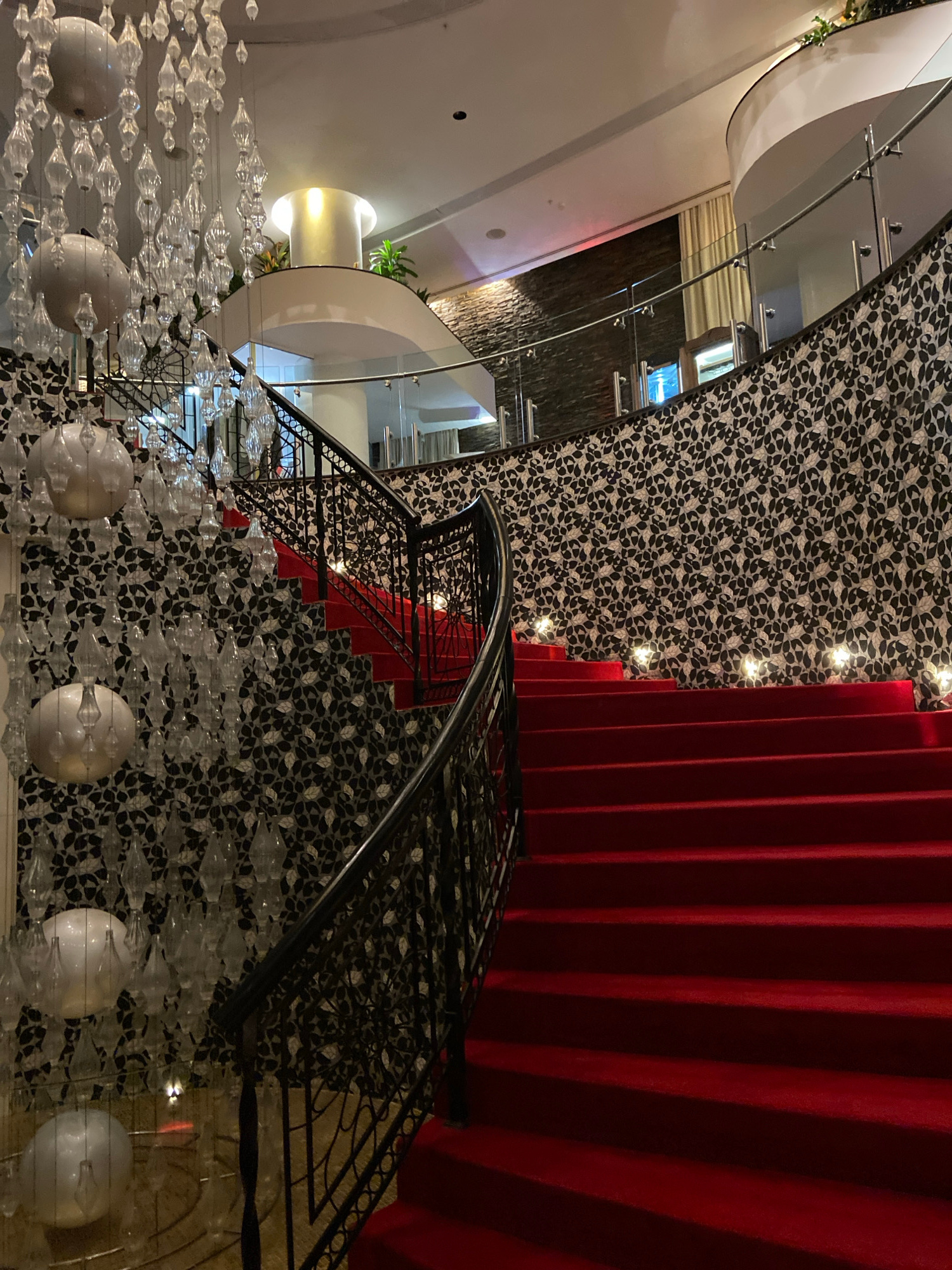The image shows an interior staircase with a red carpet runner in a building in Boreti, Montenegro. The walls are covered in a black and white floral patterned wallpaper. A black wrought iron railing…read more