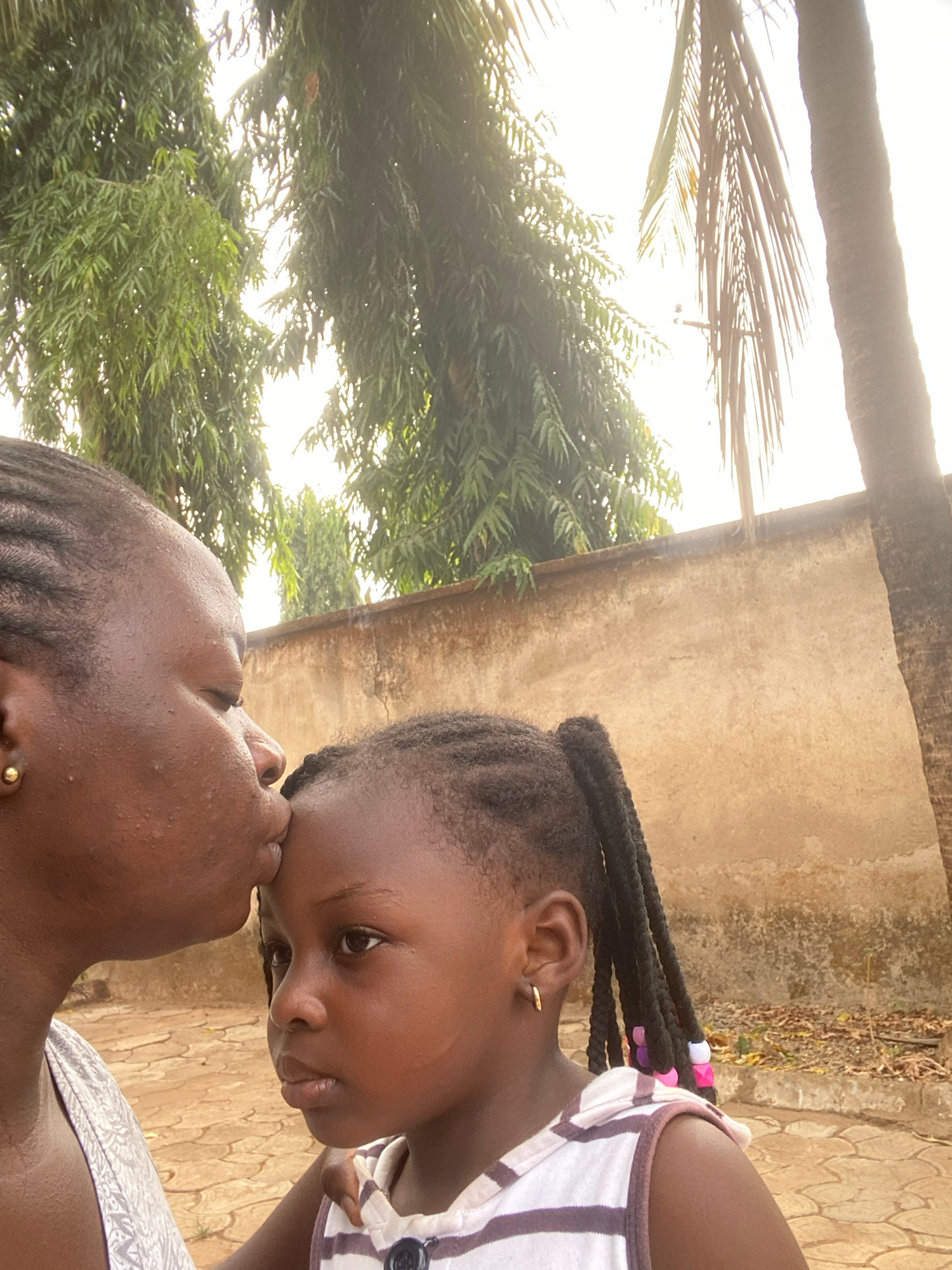 A close-up, angled shot depicts a woman and a young girl, likely mother and daughter, interacting outdoors near what appears to be a concrete wall and foliage. The woman is in the foreground, her head…read more