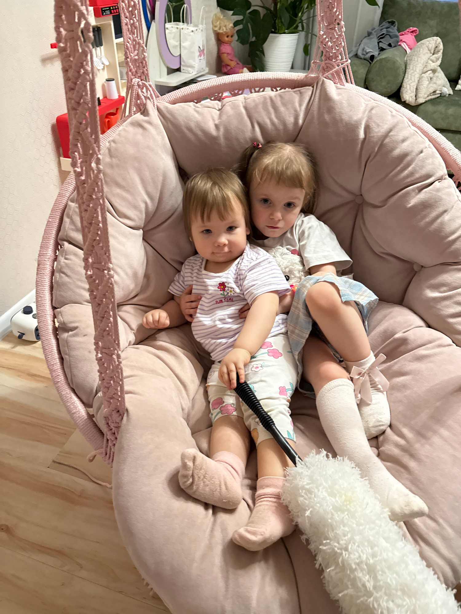 Two young children are lying together in a large, round, cushioned, light pink hanging chair. One child is wearing white knee-high socks with ribbons, a light-colored dress with blue plaid, and a ligh…read more