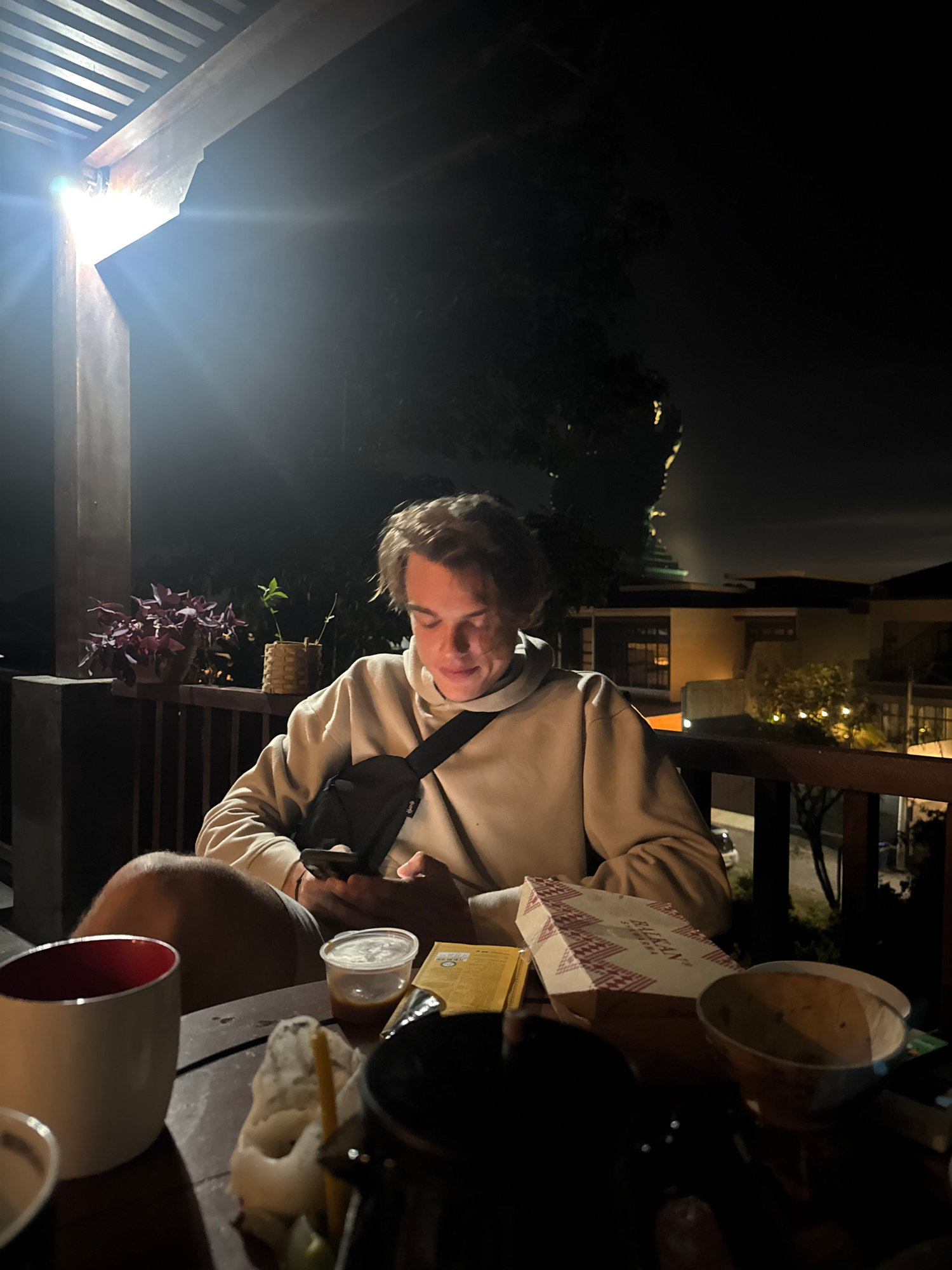 The image depicts an outdoor evening or nighttime scene in Kuta Selatan, Indonesia, featuring at least two individuals gathered around a wooden table. A young person, centrally positioned and wearing…read more