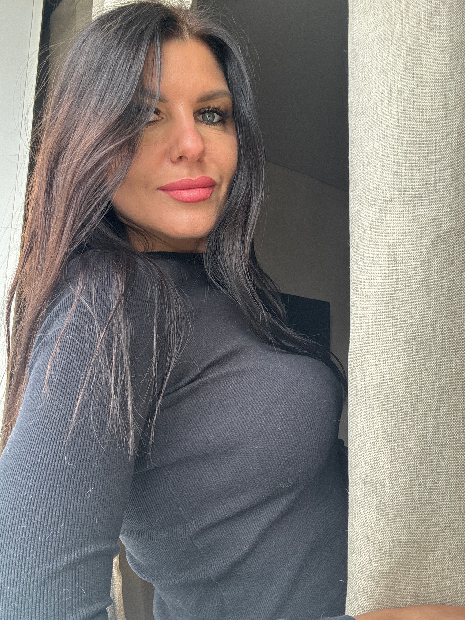 A brunette woman with fair skin and green eyes is seen from a low angle, her face partially obscured by dark hair. She has pink lipstick on. She is wearing a black ribbed sweater. The background inclu…read more