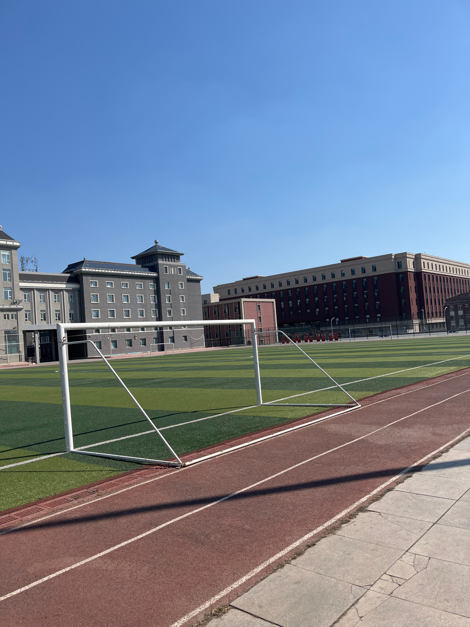 The image shows a sports field with a running track in Changchun City, China. A soccer goal stands on the green and darker green striped field. The running track is red. Adjacent to the track is a con…read more