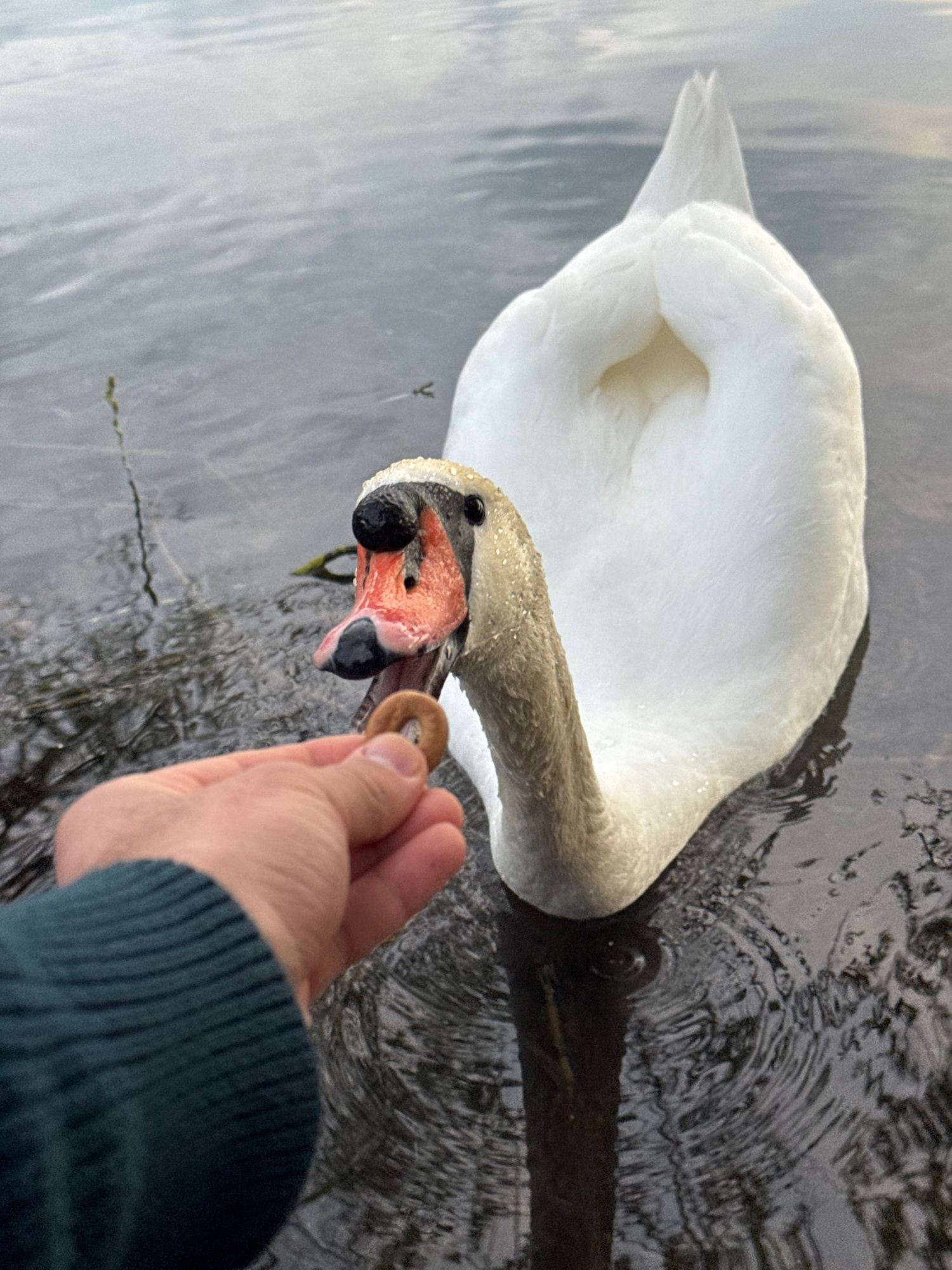 A close-up, angled photograph shows a white swan in water, being hand-fed. The swan's head and neck are tilted down towards a human hand holding a circular piece of food, possibly a bagel. The swan ha…read more