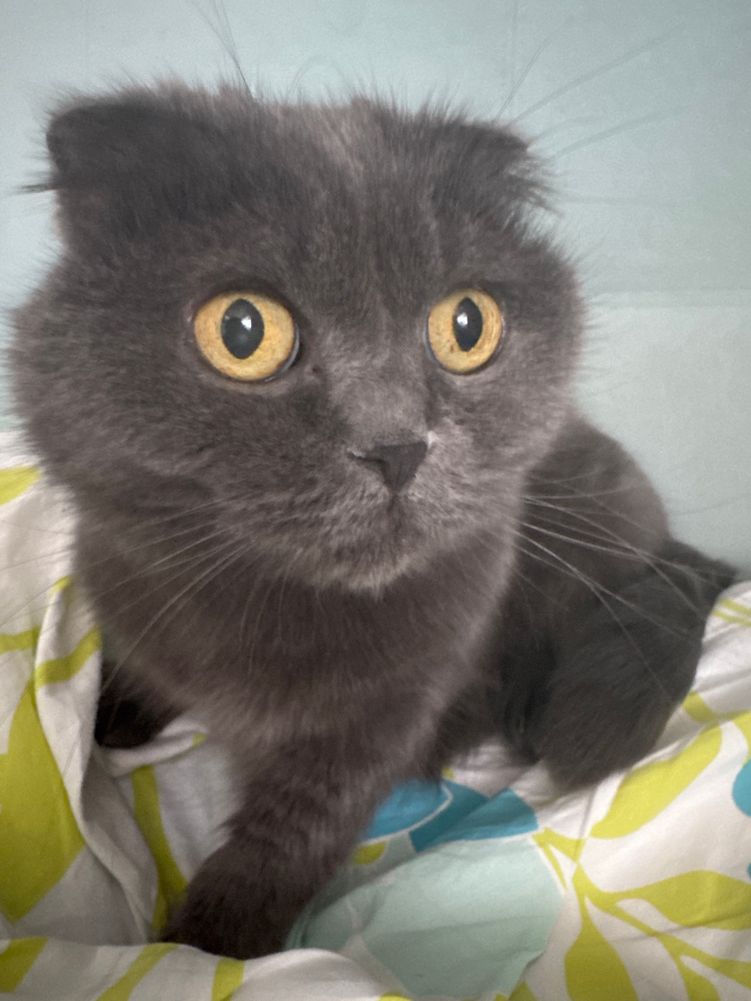 A gray cat with yellow eyes is lying on a bed with a patterned comforter. The background is a light blue wall. The location is not identifiable from the image.