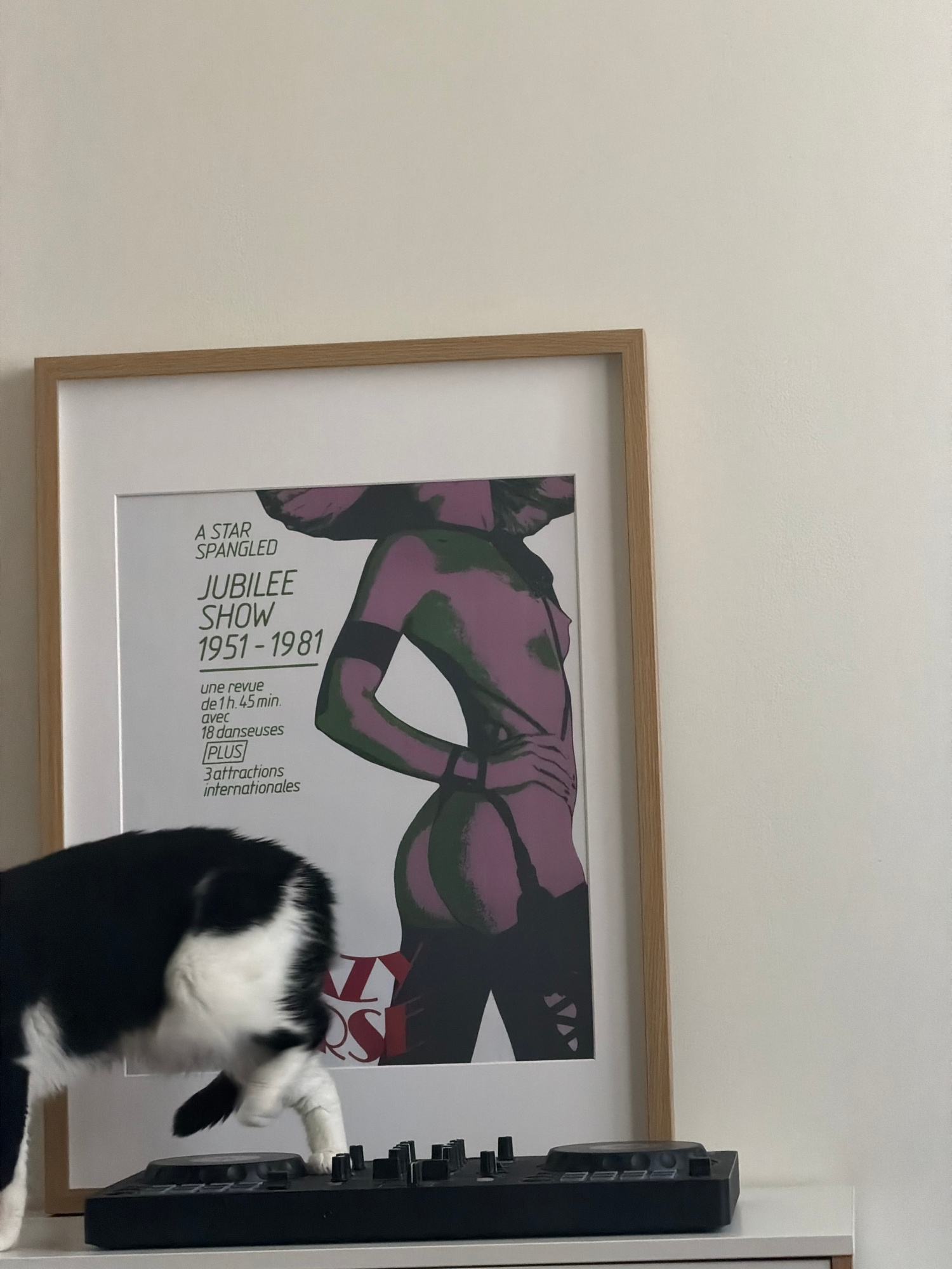 A close-up shot features a framed poster of a "Star Spangled Jubilee Show 1951-1981". A black and white cat is seen interacting with a black device attached to the wall next to the poster, its paw rea…read more