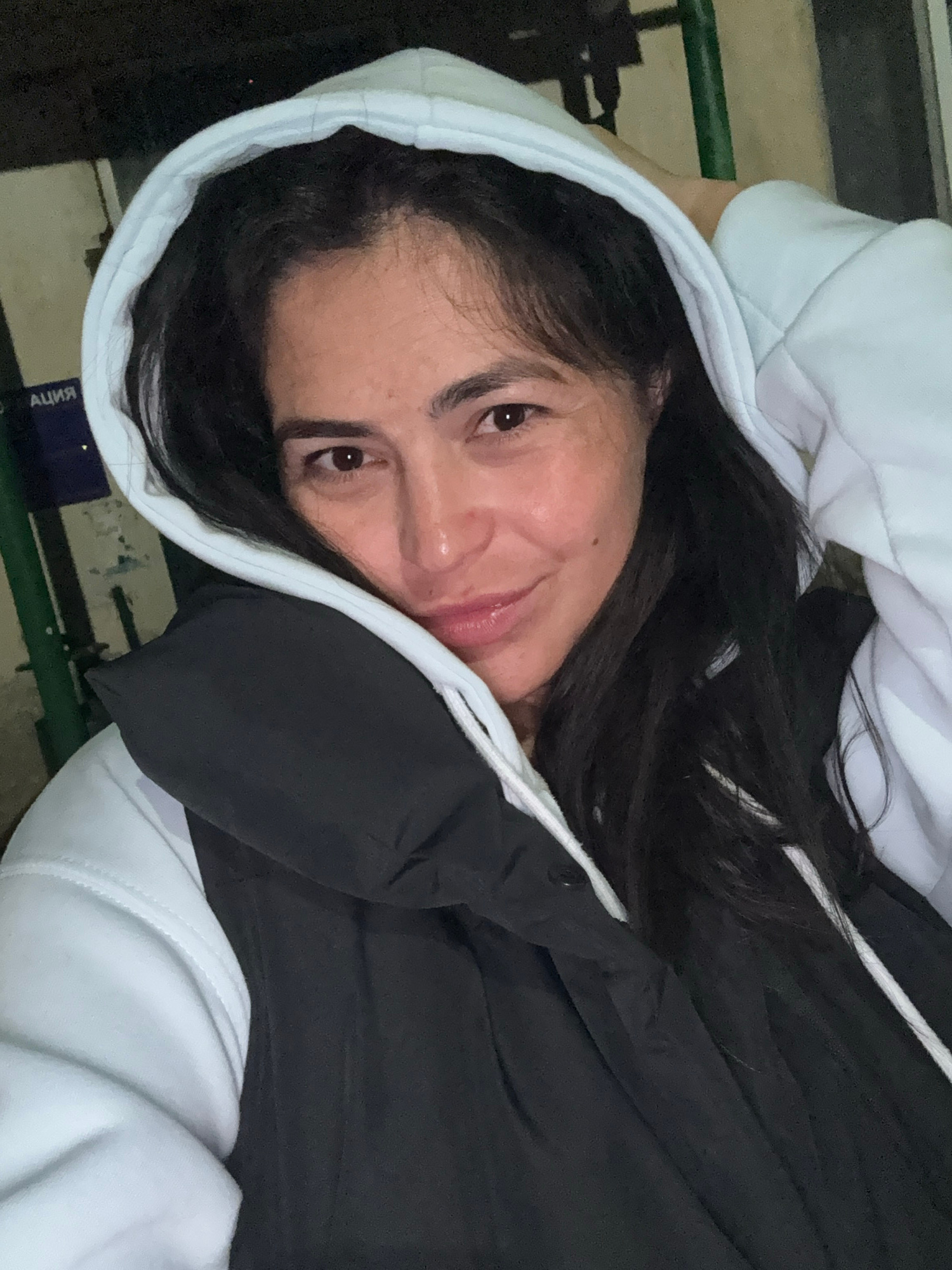 A woman with dark hair and brown eyes is wearing a white hoodie and a black jacket. She is looking directly at the camera and smiling slightly. The location appears to be indoors, possibly on bleacher…read more