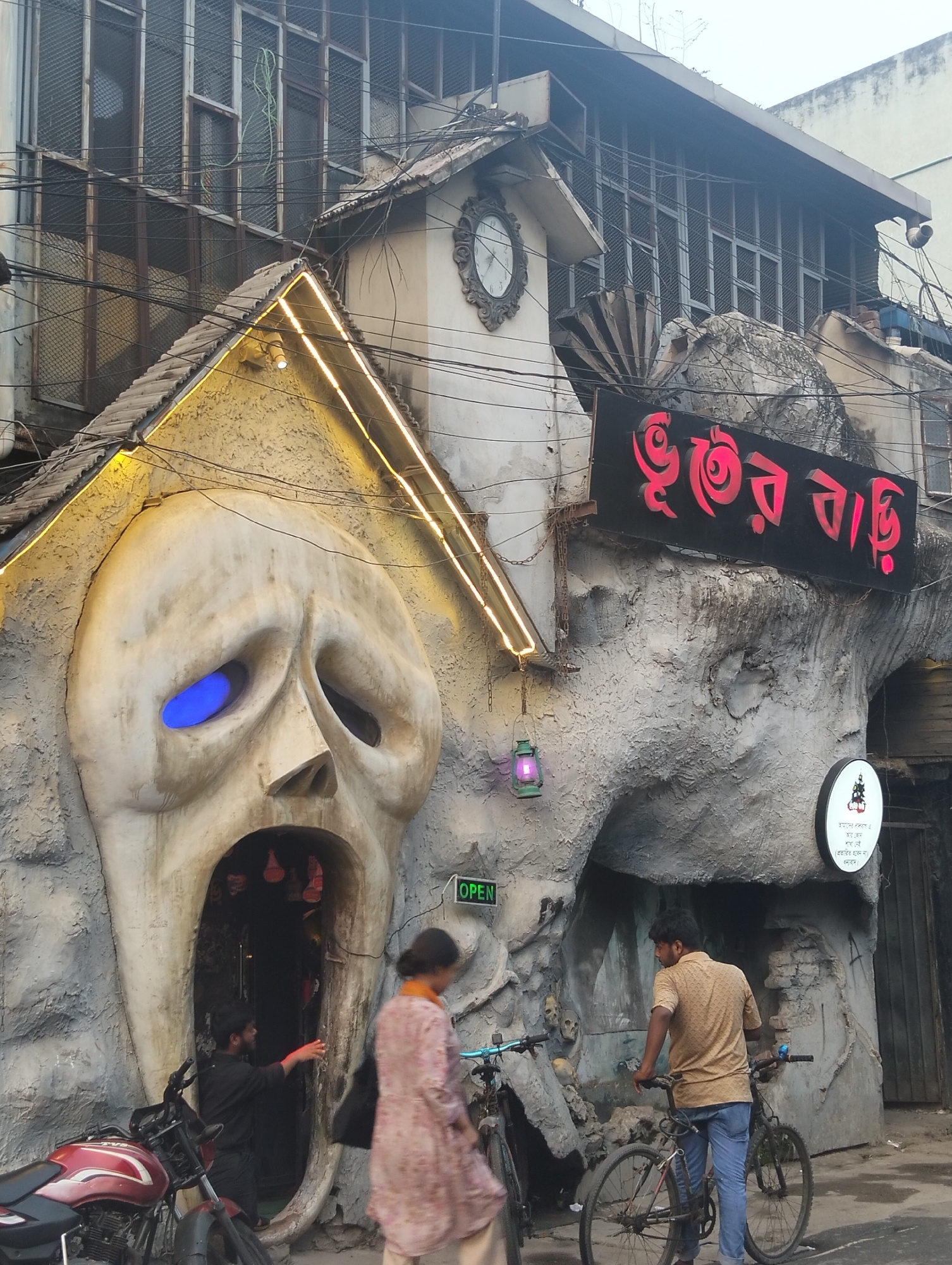 This image depicts the exterior of "Bhuter Bari," a horror-themed restaurant located in Dhaka, Bangladesh. The building is partially constructed with a large, sculpted face with a wide-open mouth servβ¦read more