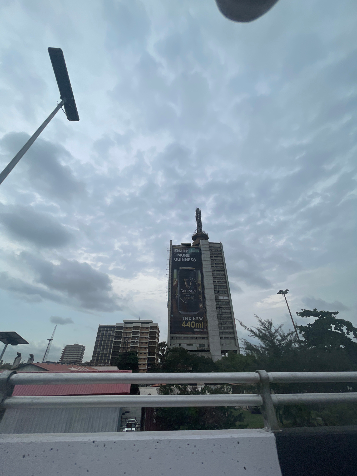 From a low vantage point, the image shows a cloudy sky over Lagos, Nigeria. Several buildings are visible, including a tall skyscraper adorned with a large advertisement for Guinness beer. In the fore…read more