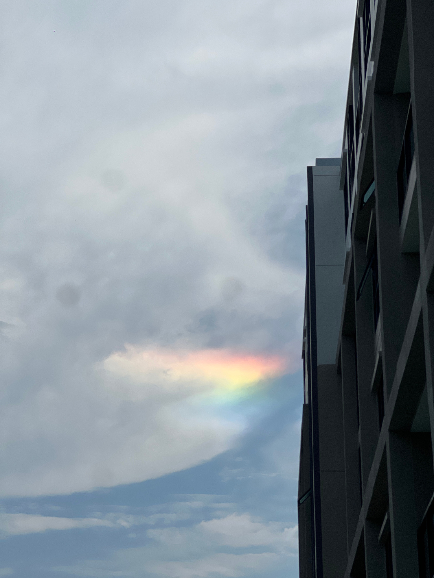 Captured from below a gray building in Choeng Thale, Thailand, a vibrant rainbow spans across a cloudy sky. The building's architectural details are visible against the bright sky. The image is rotate…read more