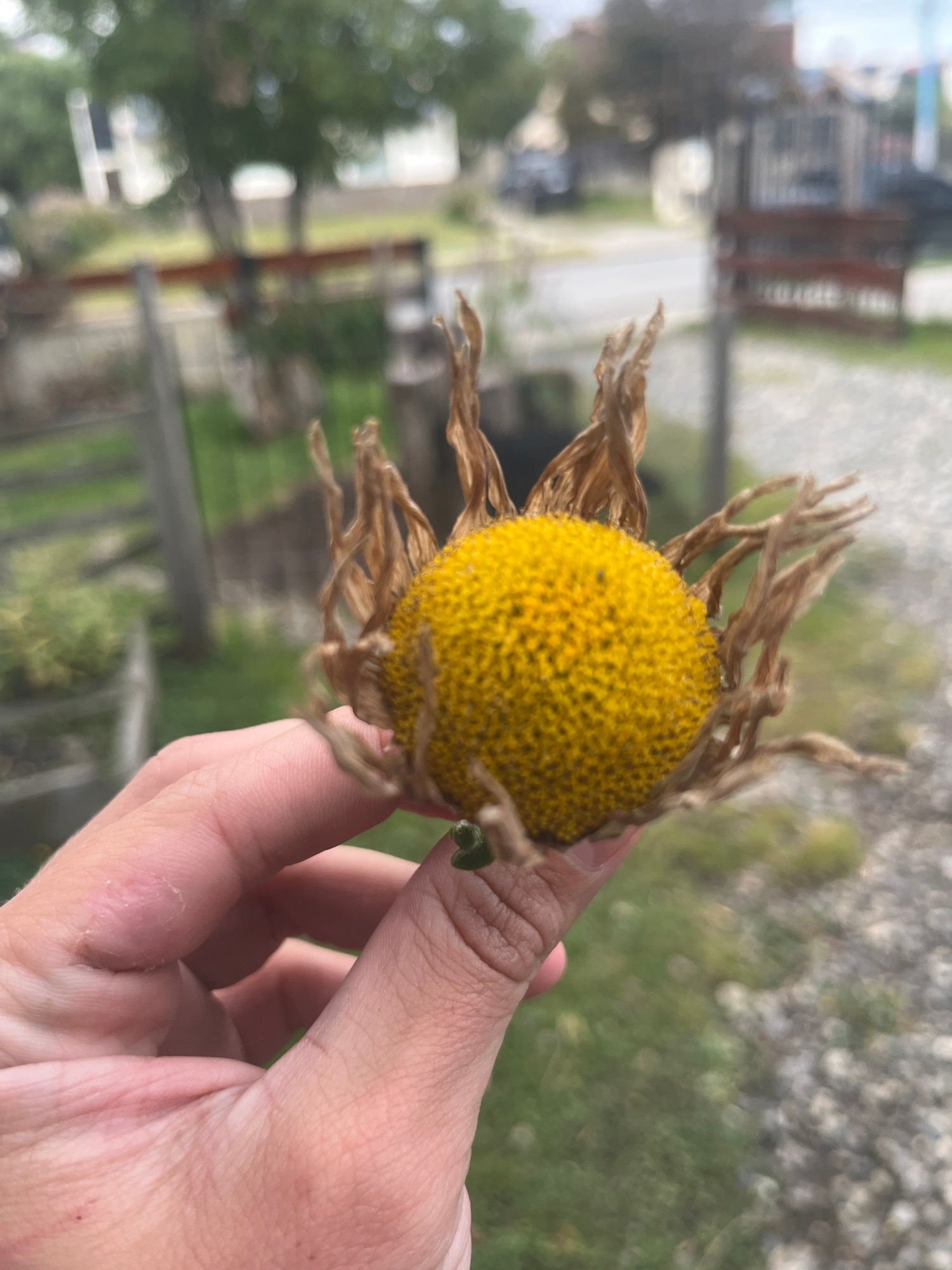 A person's hand holds a dead or dying flower with a bright yellow center and dried, brown petals. The background is blurred but appears to be an outdoor setting with greenery and structures. There are…read more