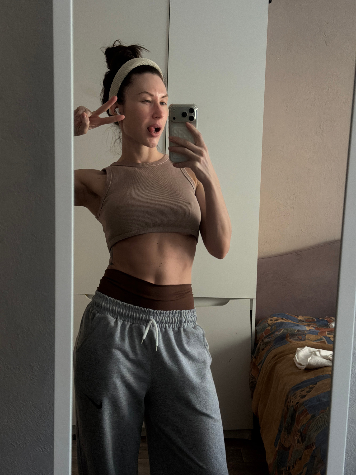 A young woman is captured in a playful mirror selfie, taken indoors in Perm, Russia. The image is oriented sideways, with the woman standing facing left, looking at her reflection. She is wearing a li…read more