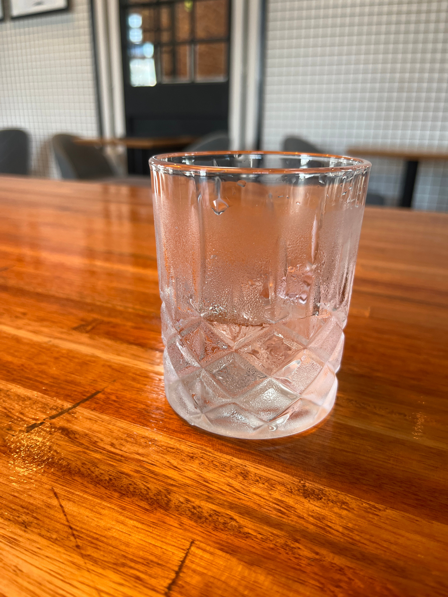 A partially full, clear, textured drinking glass rests horizontally on a wooden surface. Condensation is visible on the exterior of the glass. The surface appears to be a table top, featuring parallel…read more