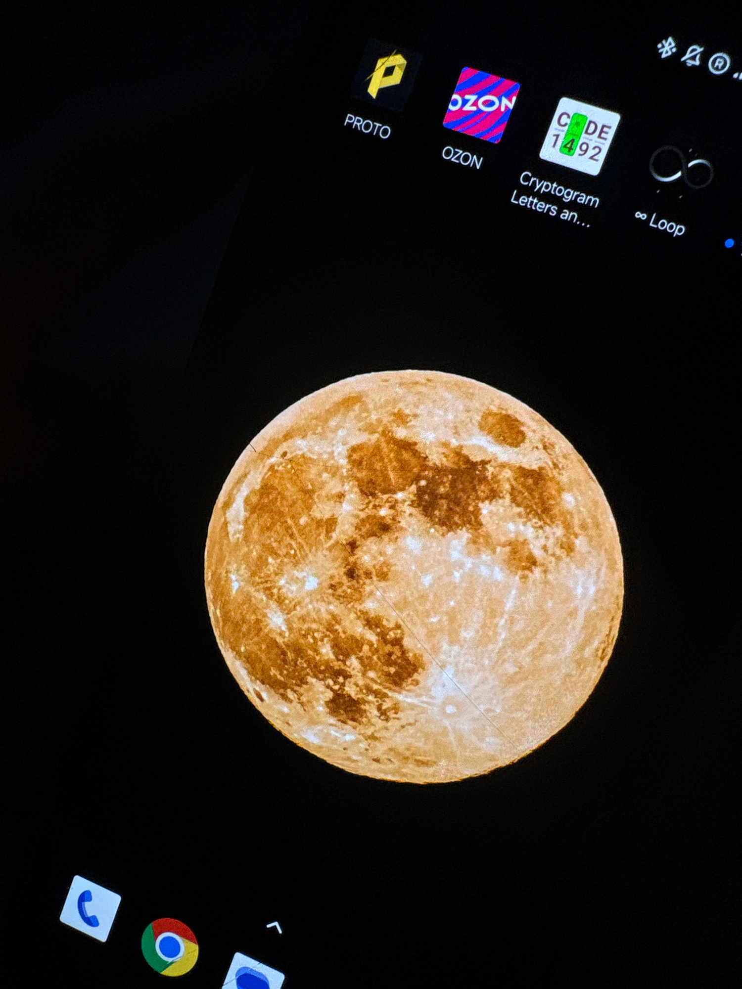 A digital device (likely a tablet or phone) displays an image of the moon on its screen, which occupies the majority of the shot. To the upper-left, some application icons are visible, including: "Cry…read more