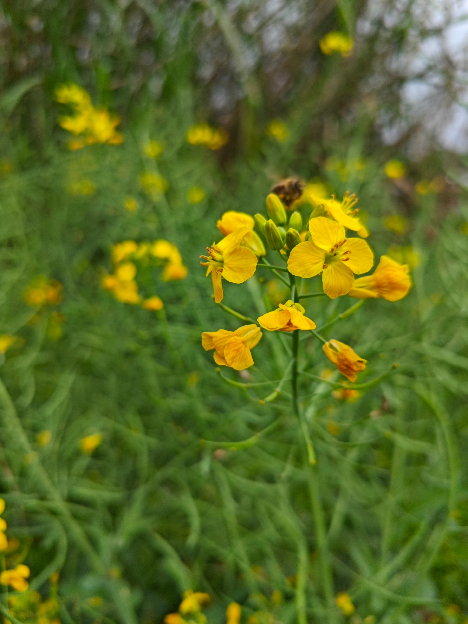 The image depicts a close-up of a cluster of small, bright yellow flowers against a backdrop of blurred green foliage. The flowers are the focal point, with several buds and open blooms visible. A bee…read more