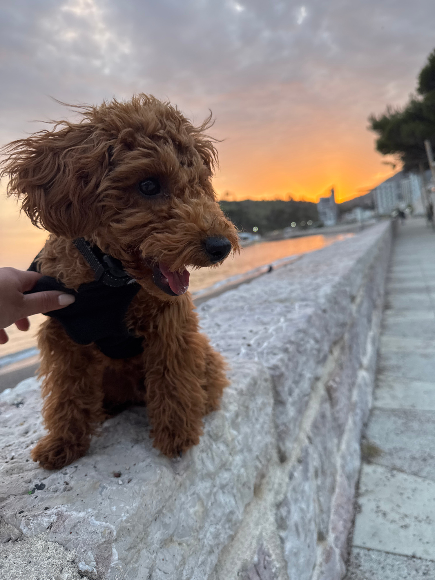 A small, fluffy brown dog, likely a poodle or poodle mix, is the primary subject of this vertically oriented image. The dog, with curly brown fur and wearing a black harness, is lying comfortably on a textured, light grey stone or concrete wall. Its mouth is slightly open, revealing its tongue, suggesting a happy or relaxed demeanor. A human hand is gently touching the dog's chest near its harness. The background features a stunning sunset over a body of water, probably the sea, given the coastal location of Sutomore, Montenegro. The sky is awash with warm orange and yellow tones, which are reflected on the water's surface. In the distance, silhouettes of hills and buildings frame the horizon. Above the vibrant sunset, the sky shows soft grey clouds, indicating a partly cloudy evening. The time of day is clearly sunset, creating a warm and peaceful ambiance. The setting appears to be a seaside promenade or similar structure. There is no visible text in the image. | Open Wire