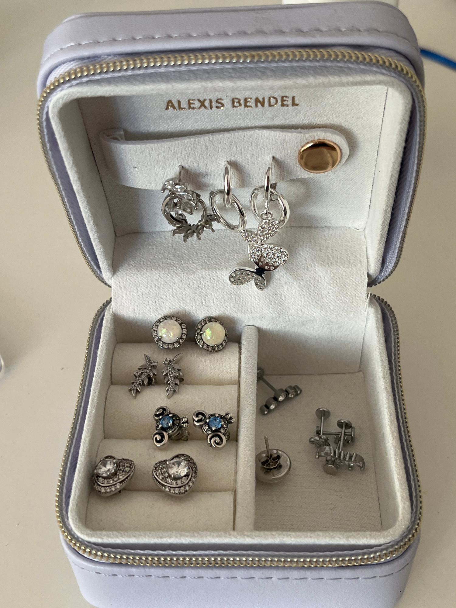 An open, lavender-colored, Alexis Bendel jewelry case is displayed. On the left side of the case are three silver-colored bracelets hanging from a snap. A silver-colored butterfly is positioned among…read more