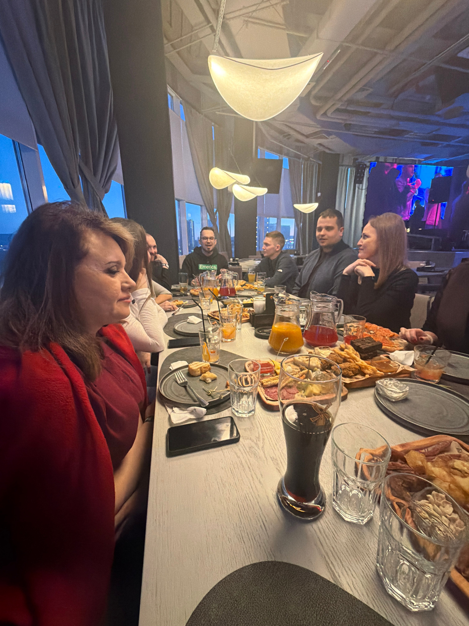 This image captures a social gathering of several people seated around a long table in what appears to be a modern restaurant or bar in Krasnoyarsk, Russia. The perspective is from the side of the tab…read more