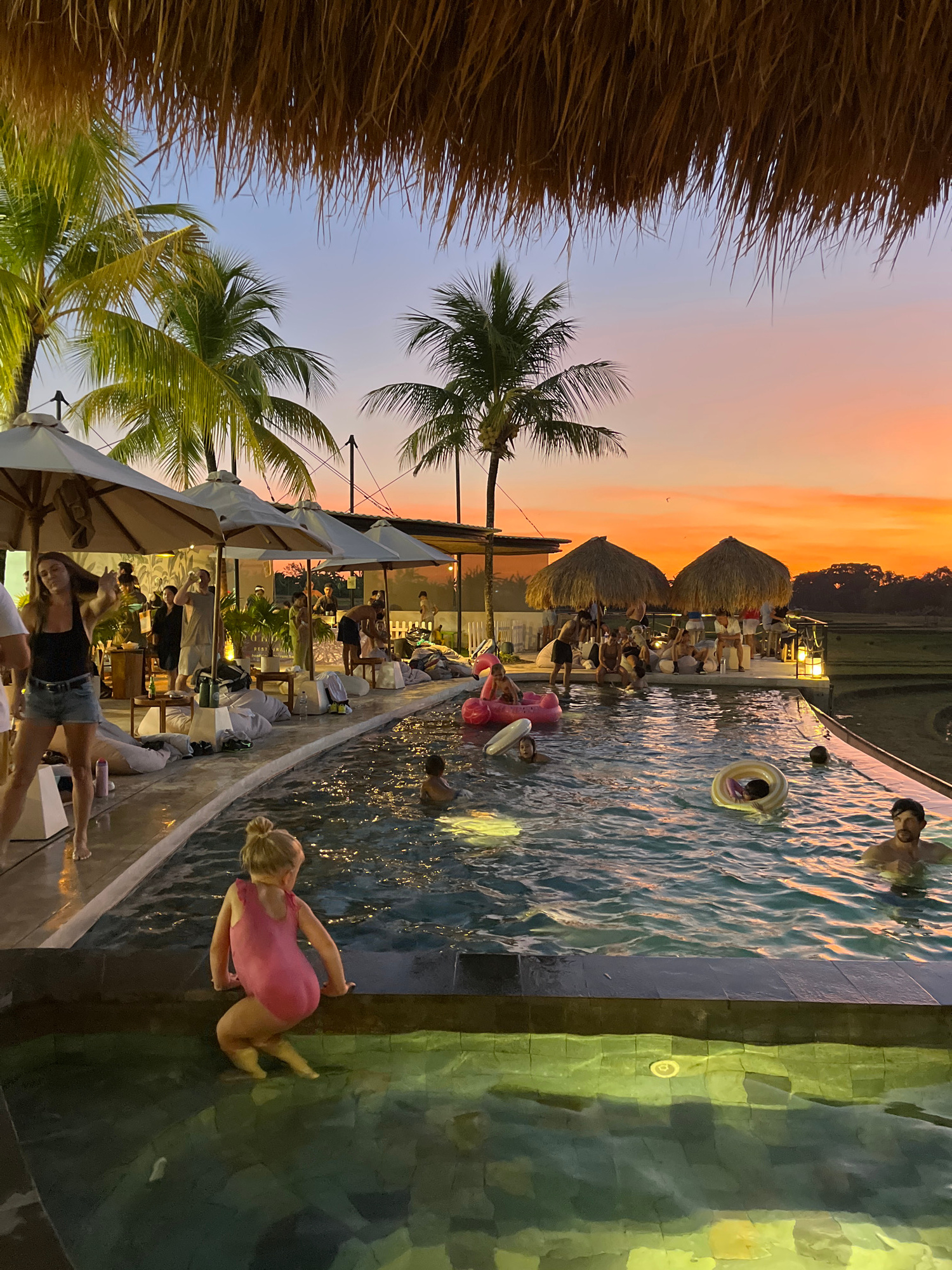 The image captures a scene at a pool in North Kuta, Indonesia at dusk. The sky is a gradient of orange, pink, and purple. The left side of the frame features a thatched roof, palm trees, and people un…read more