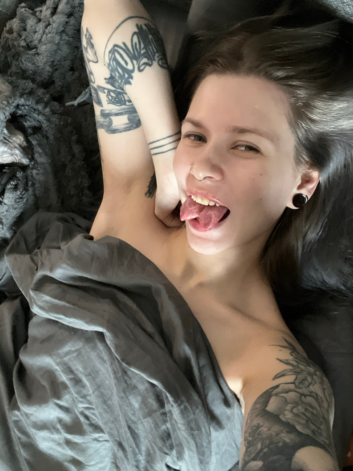 A person is lying in bed, partially covered by a gray sheet or blanket. They have dark hair, light skin, and visible tattoos on their arms. The person is sticking their tongue out and looking towards…read more
